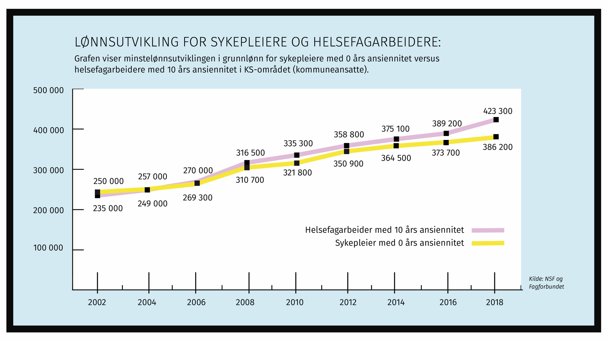 I 2018 tjente en helsefagarbeider med 10 års ansiennitet 37 100 kroner mer i året enn en nyutdannet sykepleier i kommunen. I 2002 tjente de 15 000 kroner mindre.