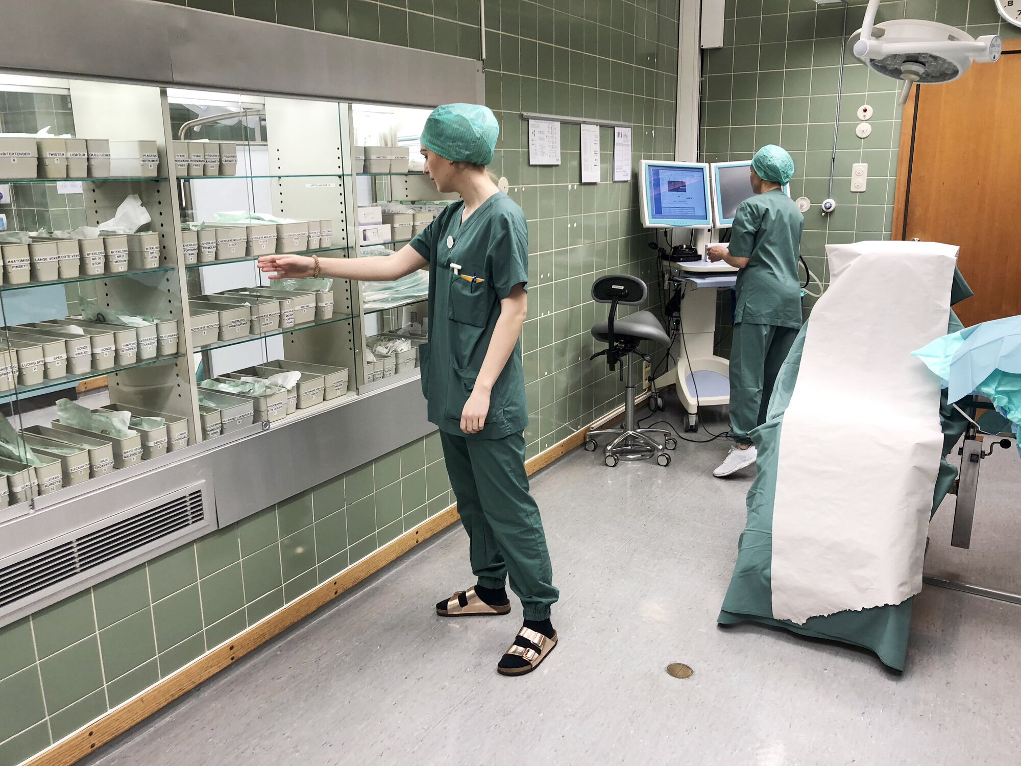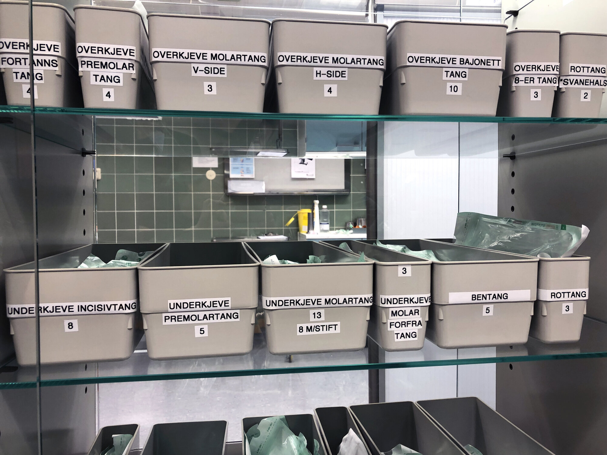 Hovland og Eilertsen åpner et skap med glassdør og viser frem forskjellig kirurgisk utstyr inne på et av rommene: En hylle for overkjeve, en annen for underkjeve.