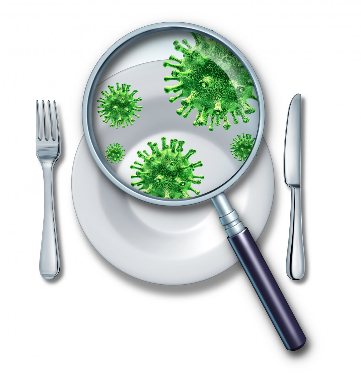 Illustrasjonen viser et forstørrelsesglass over en tallerken, og det ses mikrober.