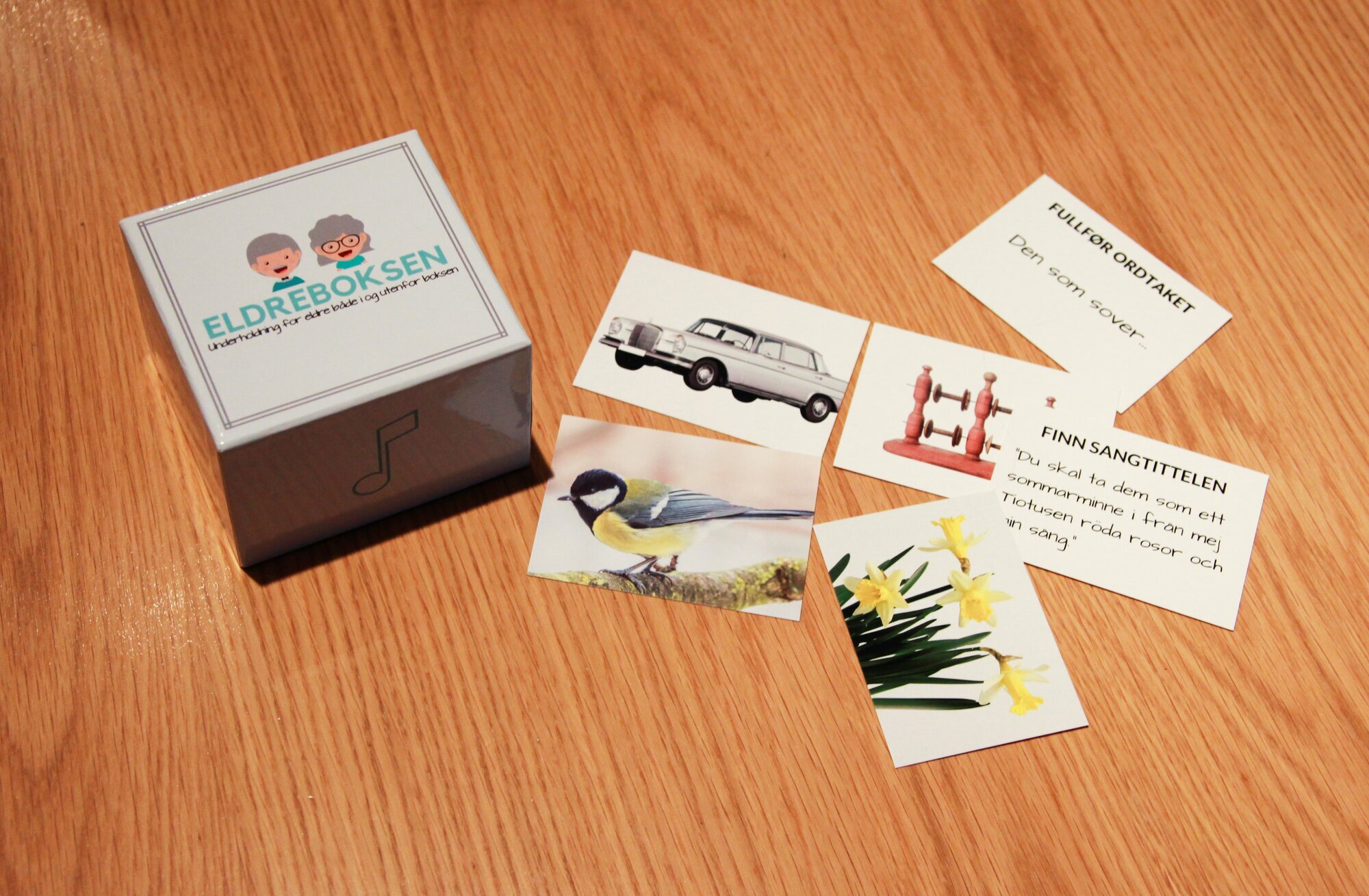 Og nettopp dette ønsket de å bygge videre på. Eldreboksen består av spørsmålskort der man blant annet blir bedt om å fullføre ordtak og huske sangtitler.