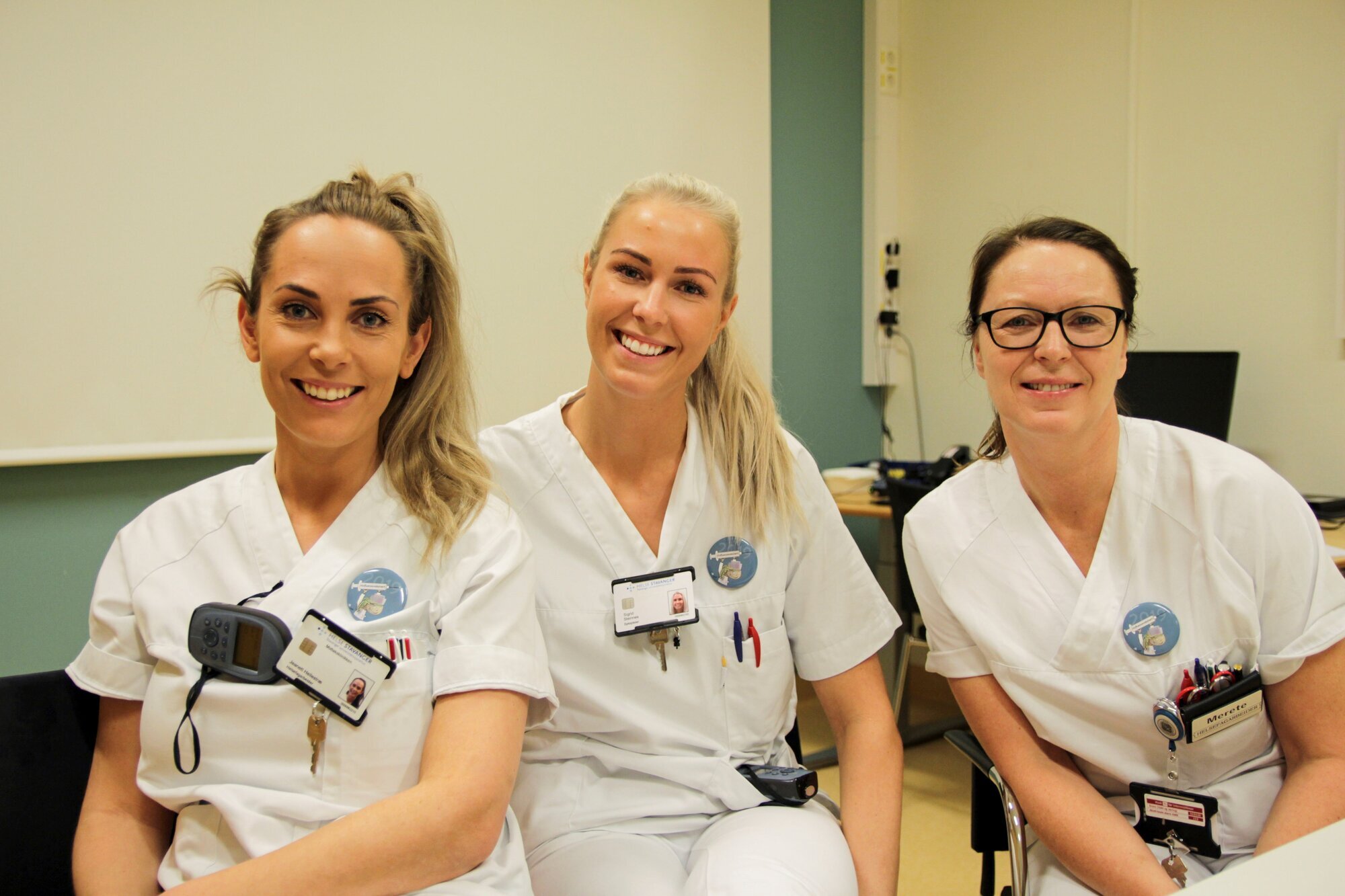 Merete Lea, Sigrid Steinnes og Jeanett A. Hellestræ er alle helsepersonell ved Observasjons- og behandlingsavdelingen (OBA), og kommer rett fra vaksinasjonsrommet. Lea og Steinnes har tatt vaksinen tidligere år, mens for Hellestræ var dette første gangen. Hun ler, og gir uttrykk for at det er flaut å prate om.