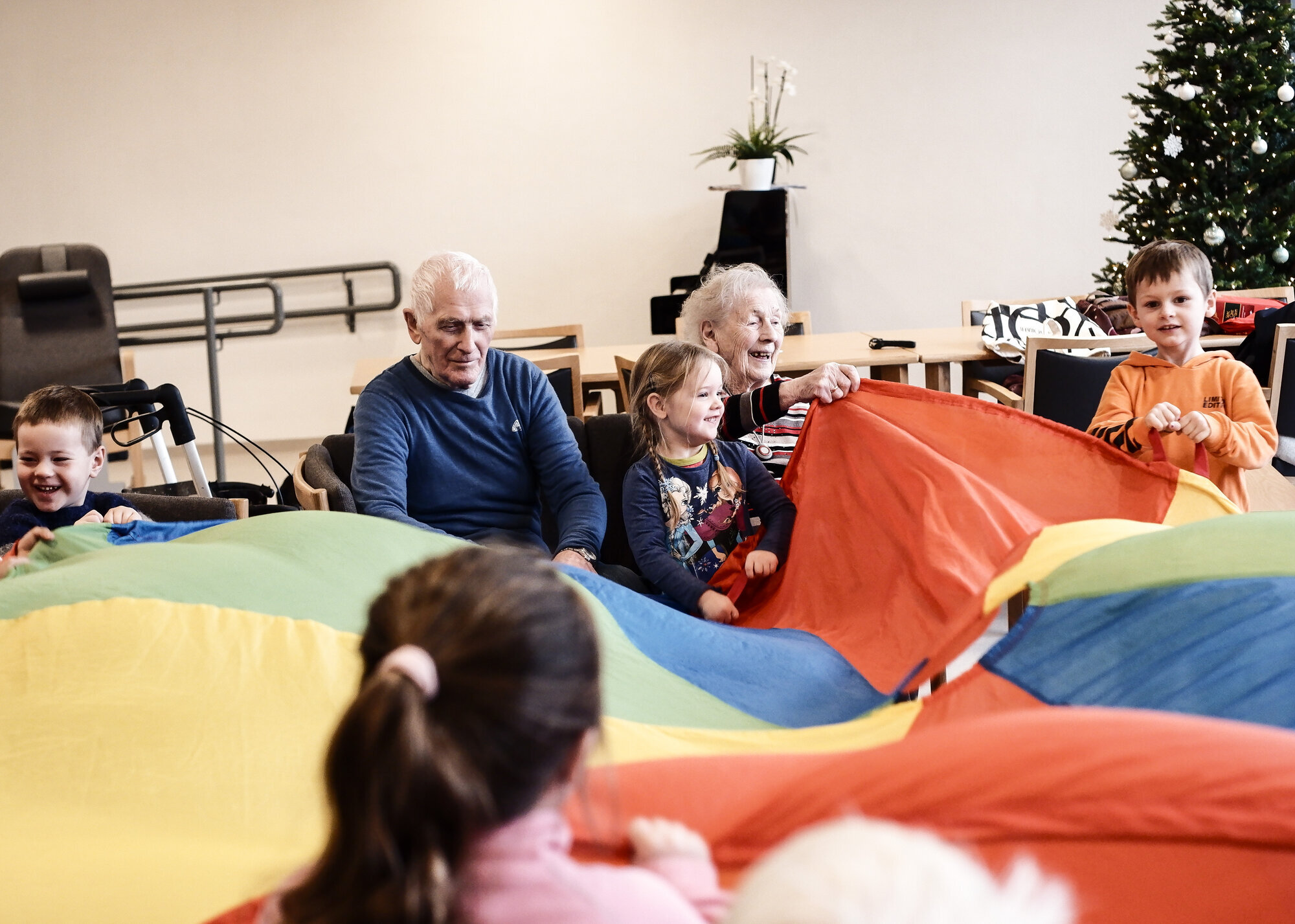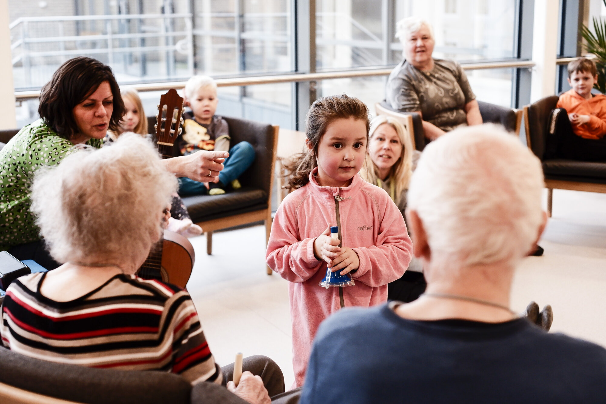 Et par av de andre beboerne begynner å småprate. Turøy drar frem et par bjeller og gir en av dem til den fleecekledde jenta og en til den eldre damen ved siden av henne. De begynner å synge. Barnas lyse stemmer forsvinner inn i de skjøre stemmene til de eldre, og det smiles fra øre til øre.