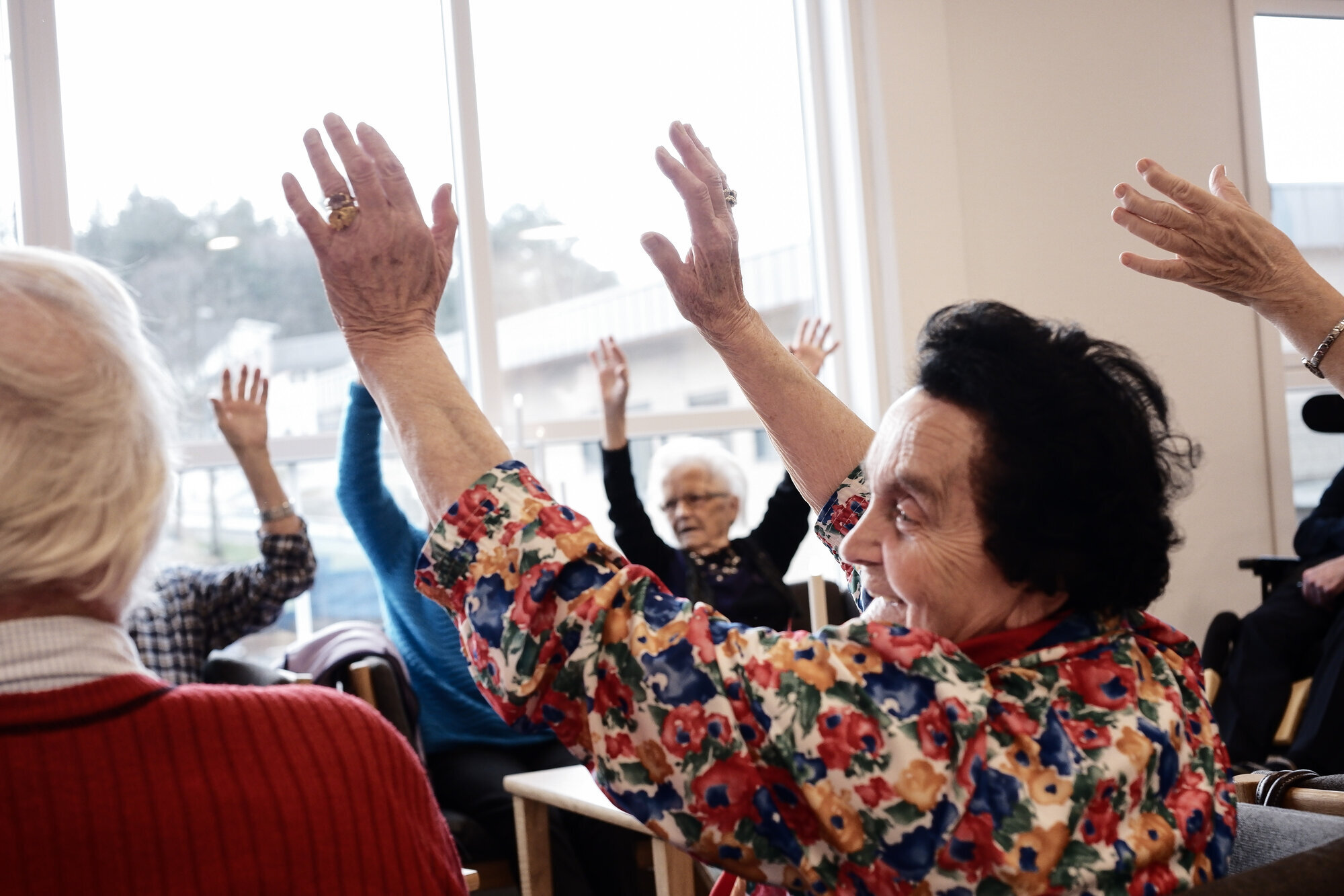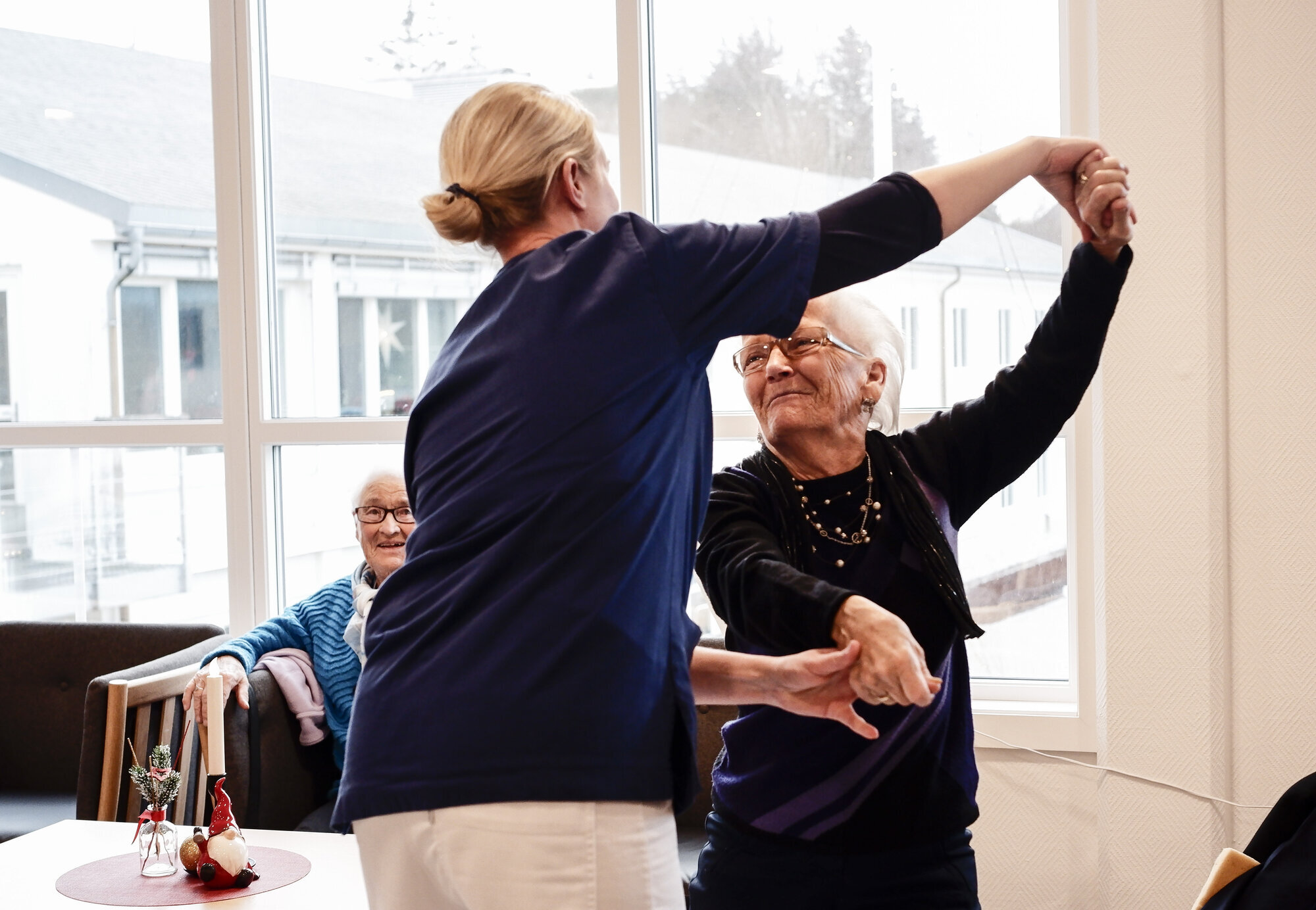 Damen som sitter under vinduet, tar ekstra i under neste låt. Hun synger plutselig høyere enn Turøy og smiler bredt. En av pleierne går bort til henne, tar henne i hånden og byr henne opp til dans. De svinger rundt i rommet, og plutselig reiser enda et par seg opp. Det nynnes og tralles, men mest av alt smiles det.