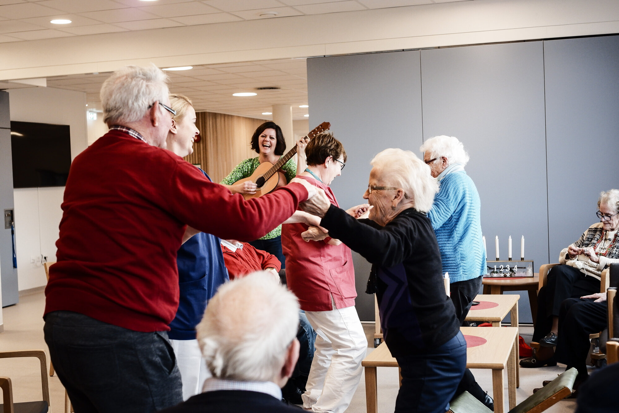 På andre siden av rommet sitter en mann i en rullestol. Han lener hodet tilbake og har forsvunnet inn i drømmeland. En i blomstrete bluse titter nysgjerrig på gitaren, hun virker spent, kanskje hun gleder seg til det som snart kommer.