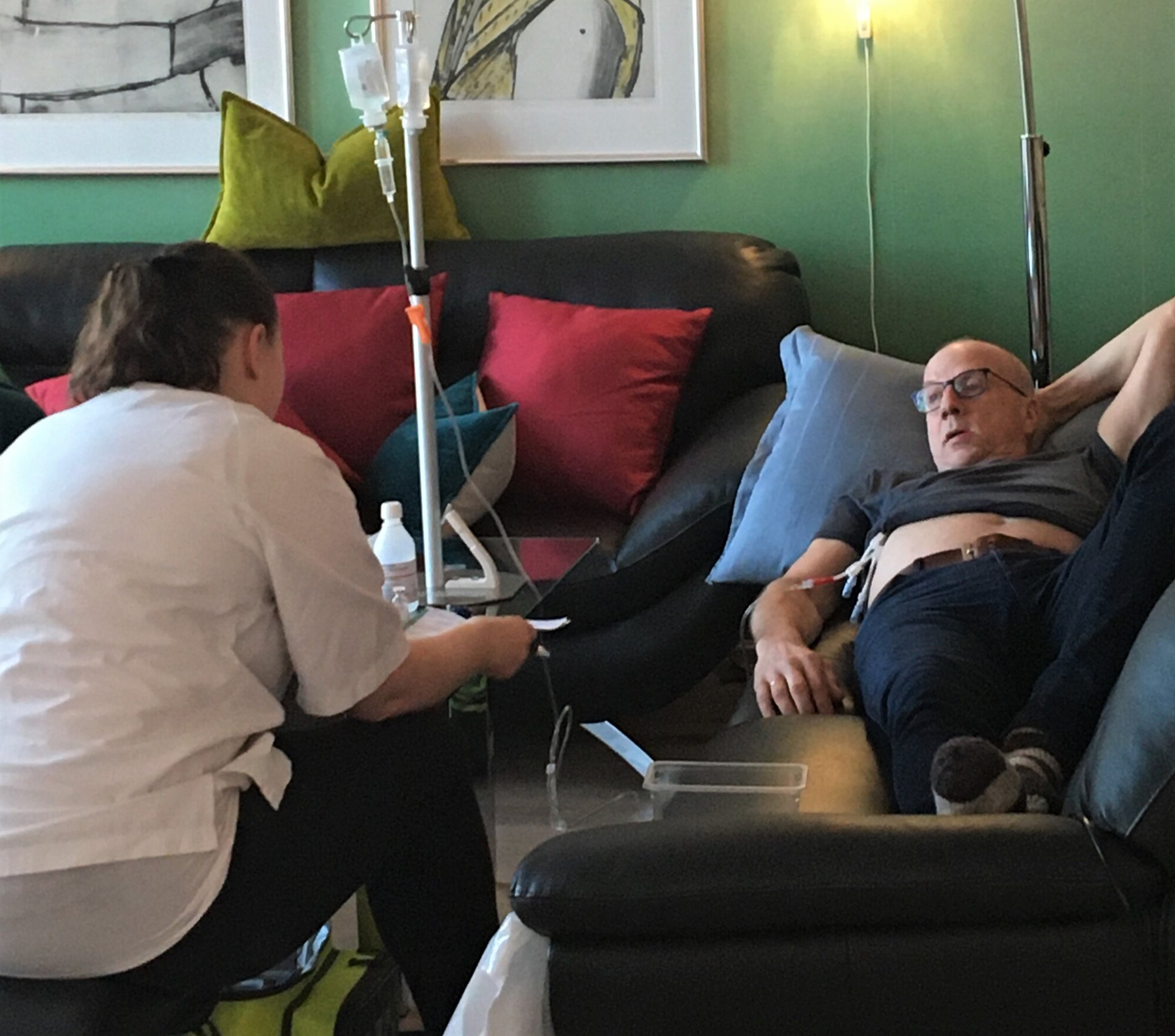 Her oppe i åttende etasje har mannen Bjørn Vidar Grønvold hatt avansert hjemmesykehus. Han har fått cellegift på sofaen og har fremdeles et sentralt venekateter under genseren.