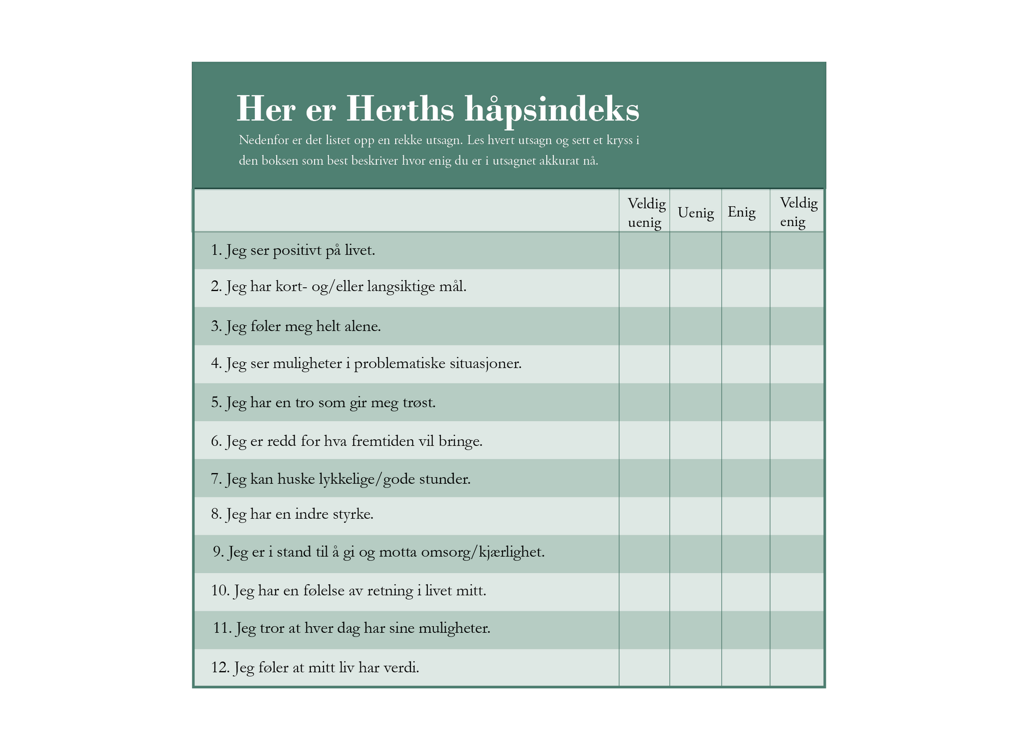 Herths håpsindeks er verktøyet sykepleiere kan bruke både i klinikken og i forskningen. Det lar deg sjekke nivået av håp hos pasientene og vurdere effekten av ulike tiltak for å øke håpet.