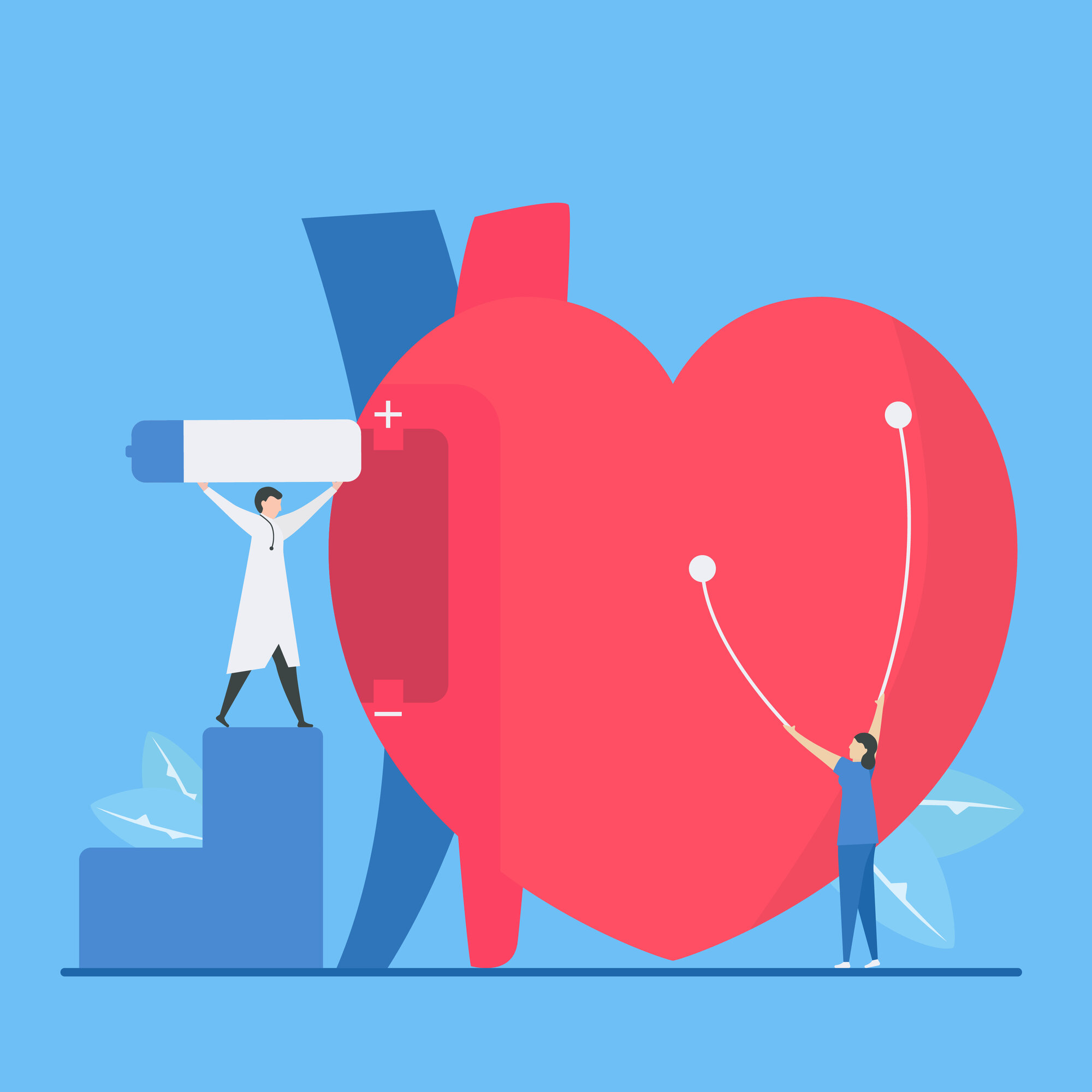 Illustrasjonen viser et stort hjerte som små helsepersonell forsøker å reparere.