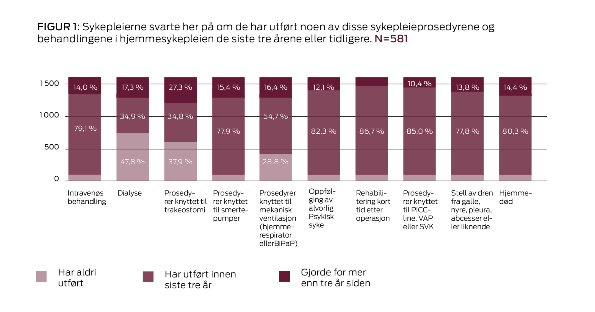 I Sykepleiens undersøkelse svarer 78 prosent at de har utført prosedyrer knyttet til smertepumpe og stell av dren fra galle, nyre, pleura, abscesser eller liknende, intravenøs behandling og oppgaver i forbindelse med hjemmedød de siste tre årene.