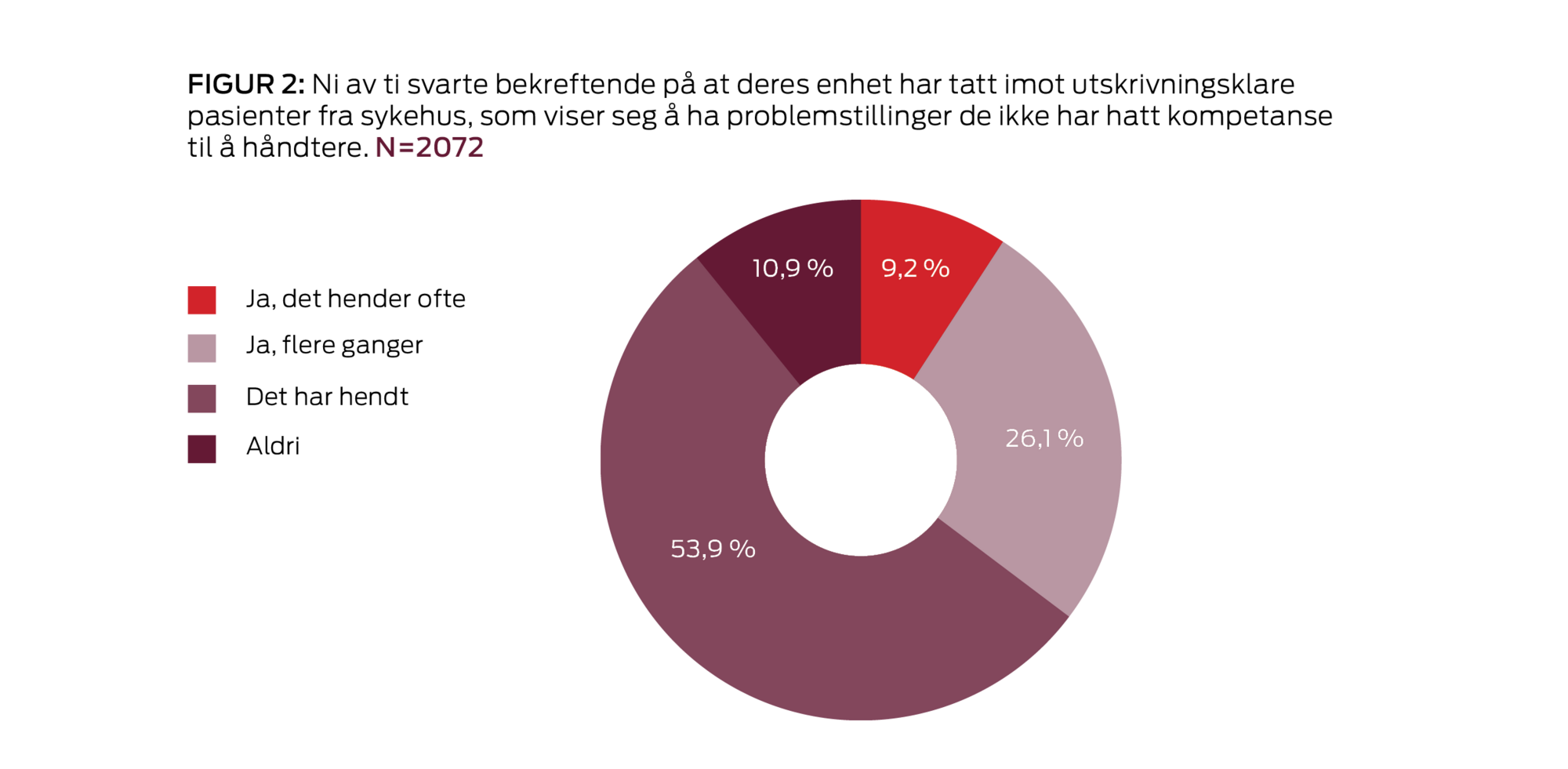 Og 9 av 10 svarer at deres enhet har tatt imot utskrivningsklare pasienter fra sykehus som viser seg å ha problemstillinger de ikke har hatt kompetanse til å håndtere.