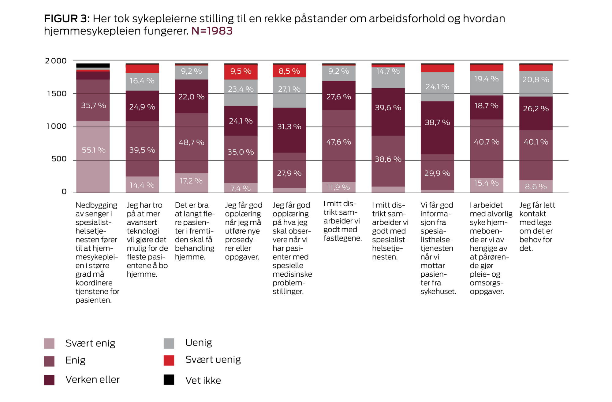 I Sykepleiens undersøkelse er 2 av 3 hjemmesykepleiere enig i at det er bra at langt flere pasienter i fremtiden skal få behandling og pleie hjemme. (Se grafikk, figur 3, lenger opp i saken.)