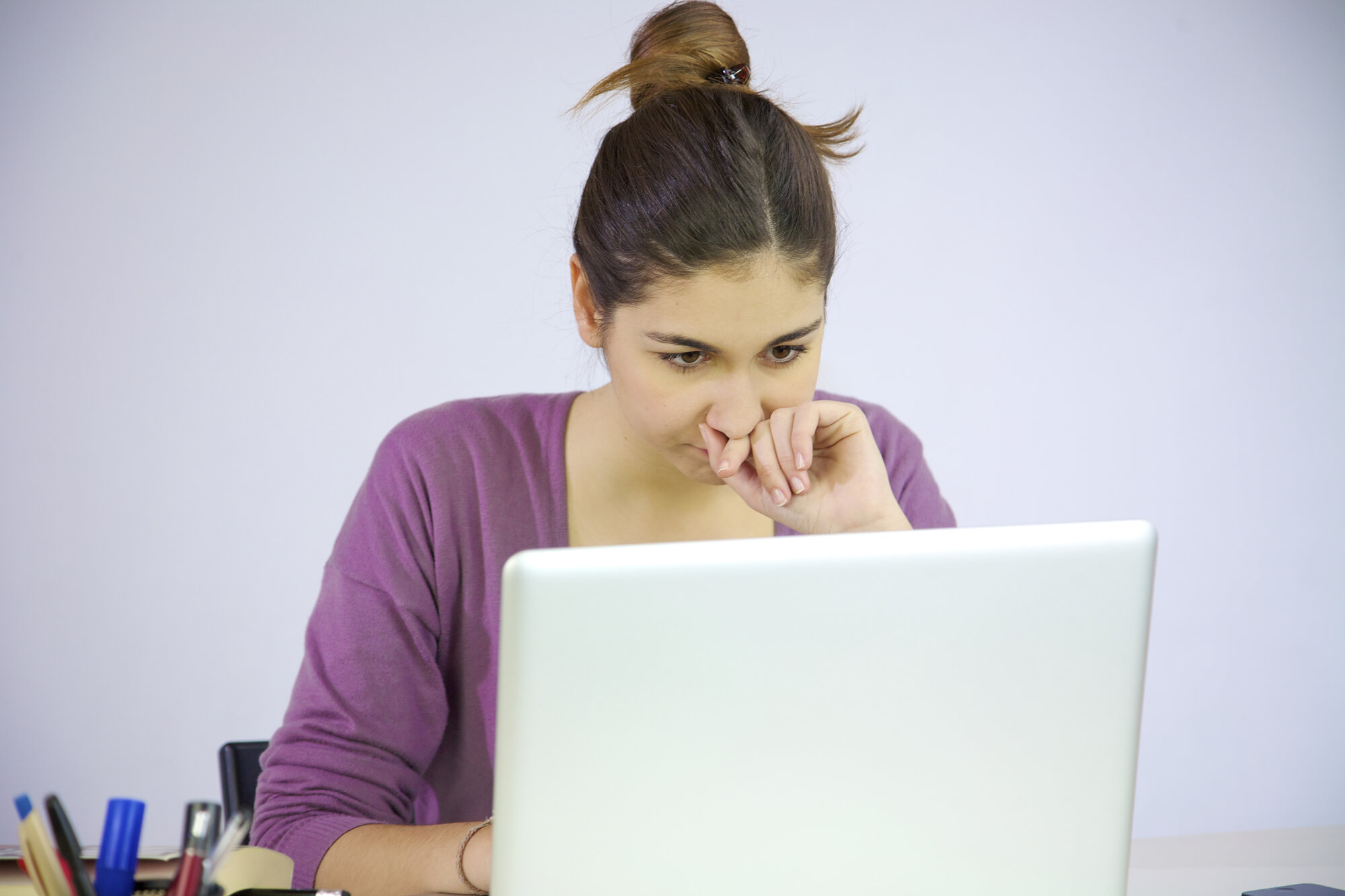 Bildet viser en kvinne som sitter ved en datamaskin.