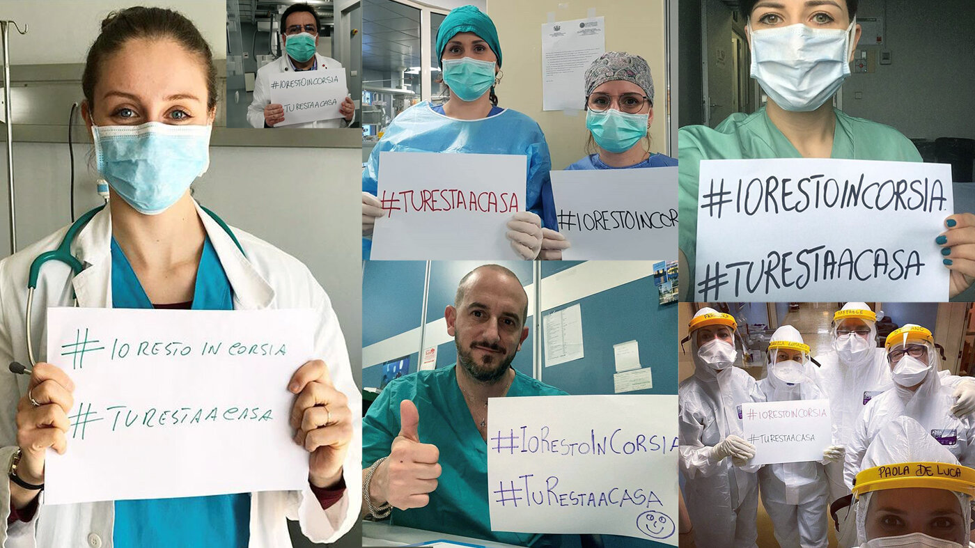 Slagordet «Io resto in corsia, tu resta a casa» eller «vi forblir på post, du forblir hjemme» ble laget på Ospedale Clinico i Bari, på adriaterhavskysten av Italia, og sprer seg nå på Instagram.