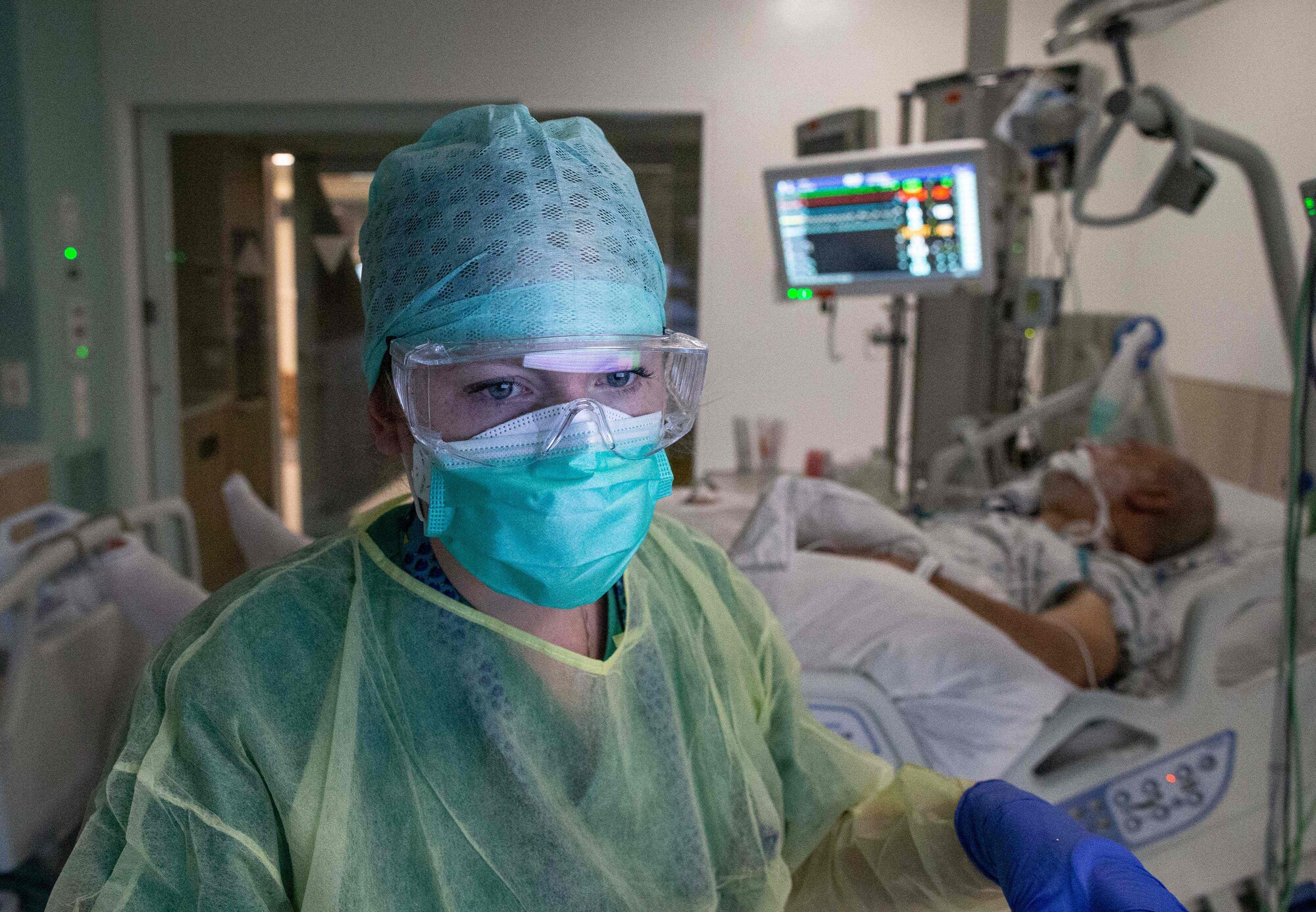 Bildet viser en sykepleier i smittevernutstyr og en pasient som blir overvåket i bakgrunnen.