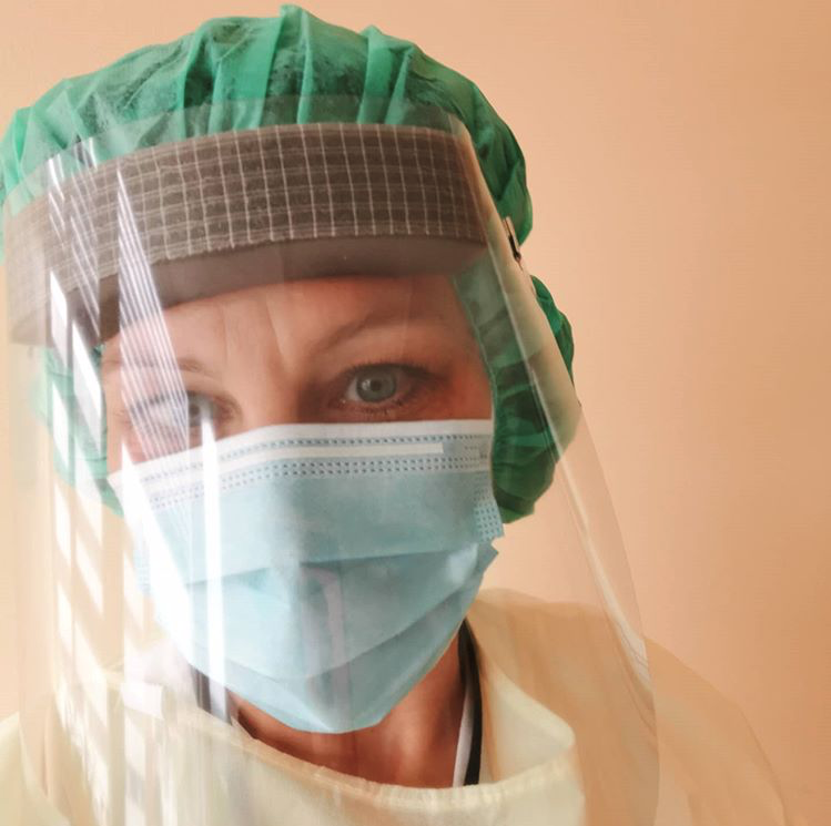 På covid-vakt inne på luftsmitteisolatet bruker hun blant annet åndedrettsvern, hette, briller eller visir.