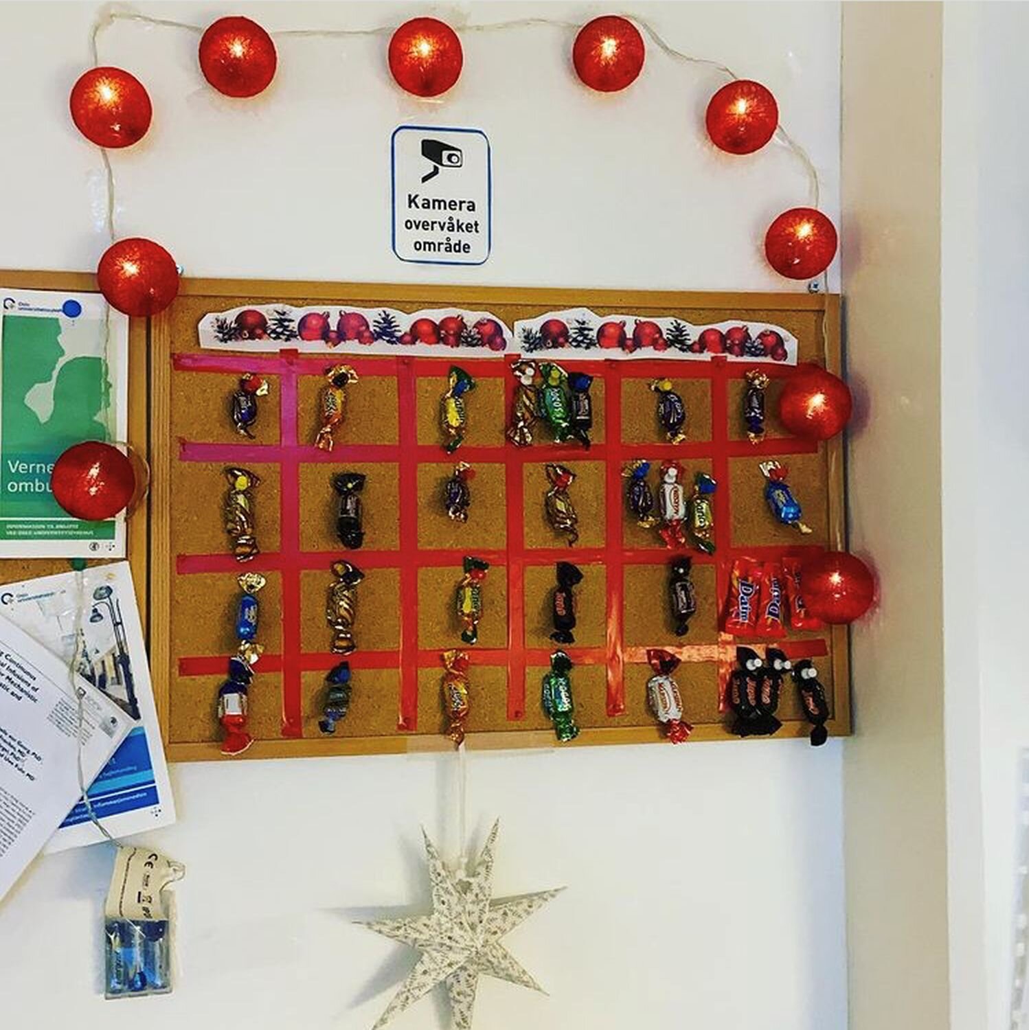 I slutten av november delte avdelingen bilde av årets kalender på Instagram. Den er laget ved hjelp av en oppslagstavle i kork, noen julekuler og en pose Twist de fikk i gave av en sykepleier fra en annen avdeling.