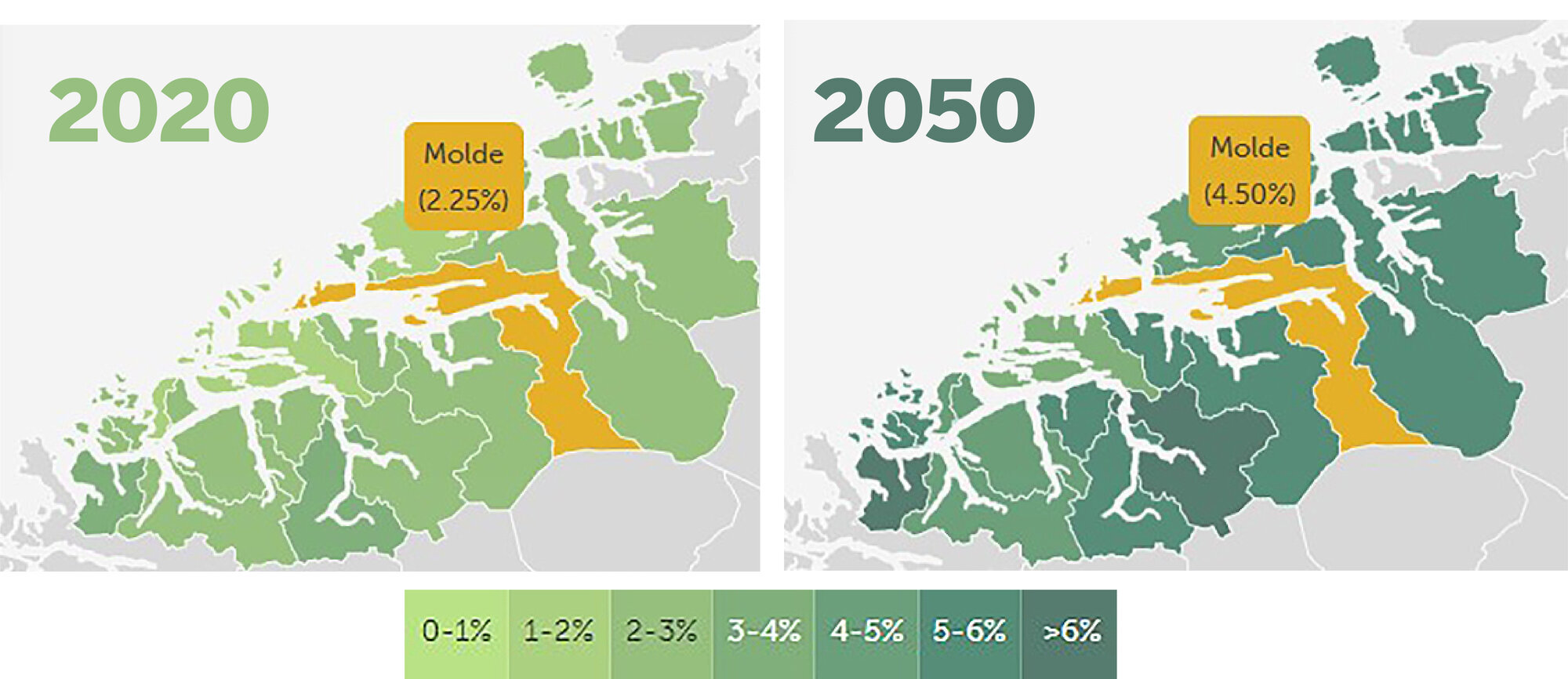 Blant annet viser kartet at andelen personer med demens i Viken i 2020 er på 1,85 prosent, mens den i 2025 vil være 2,09 prosent. I 2030 vil det være 2,44 prosent, ifølge kartet.