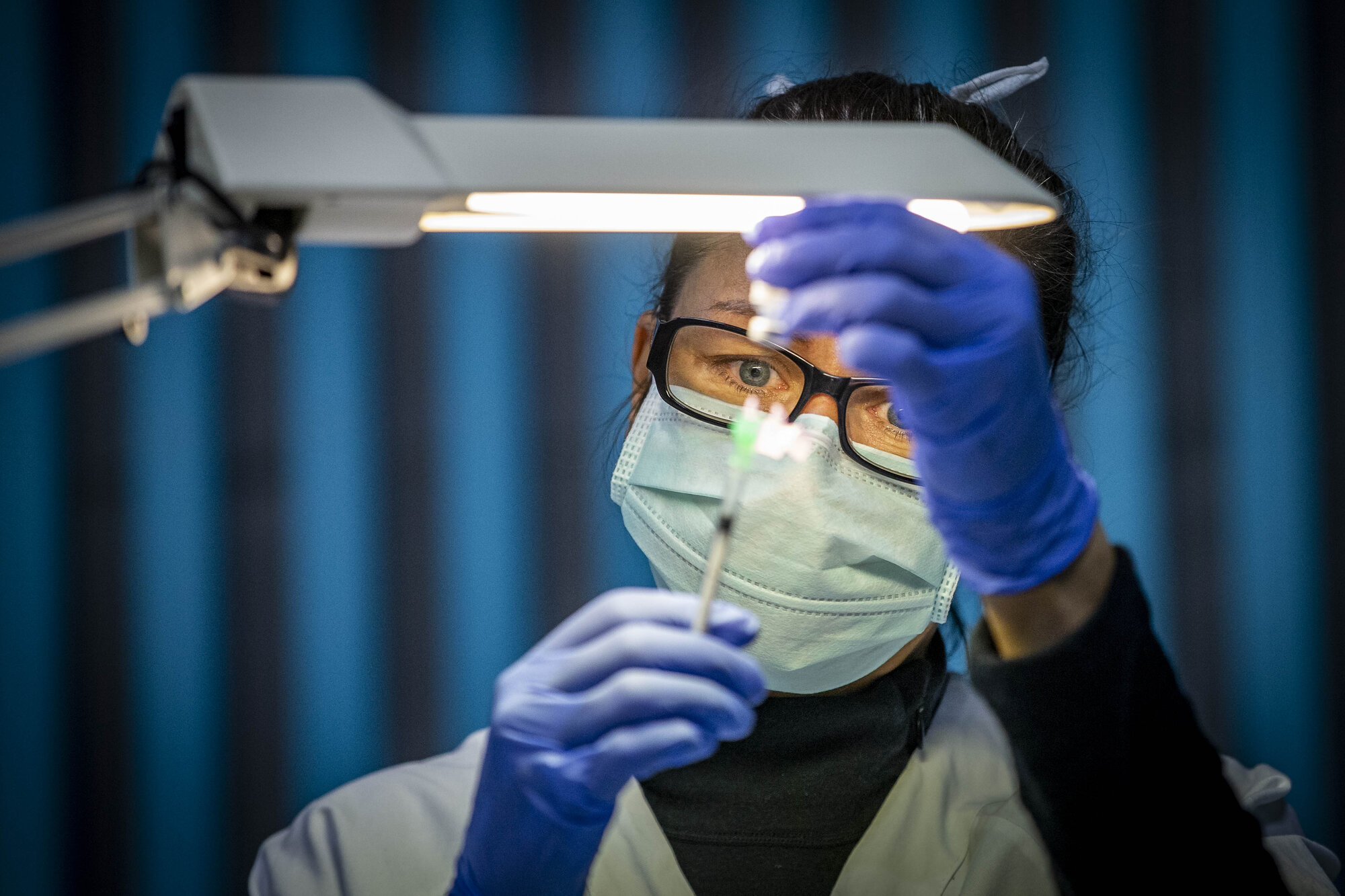 Bildet viser apotektekniker som trekker opp koronavaksine.