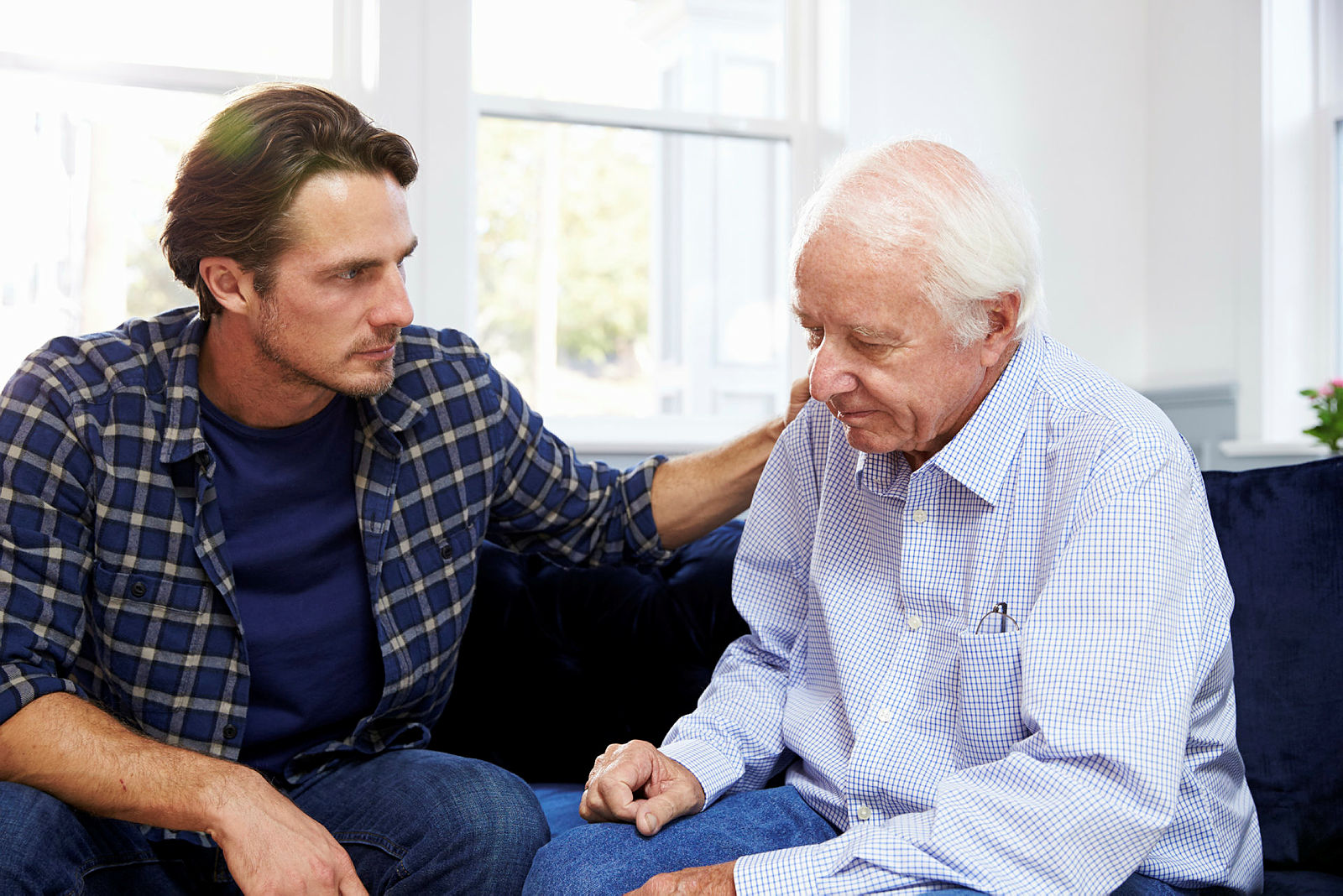 Bildet viser en sønn som snakker med en eldre, syk og nedfor far. Han holder armen trøstende på skulderen til faren.