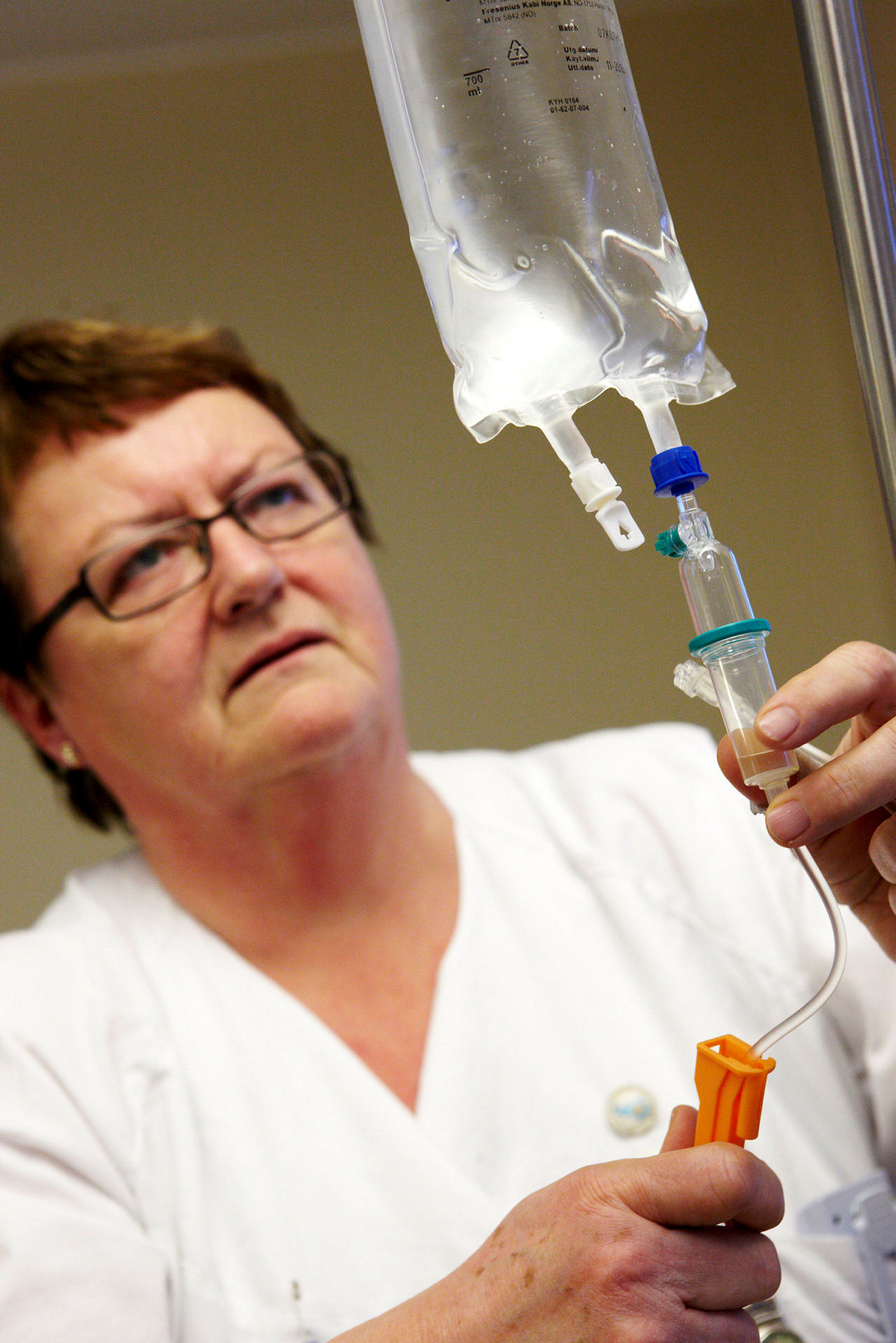 Spesialsykepleier i geriatri Bjørg Myhre forbereder intravenøs behandling.