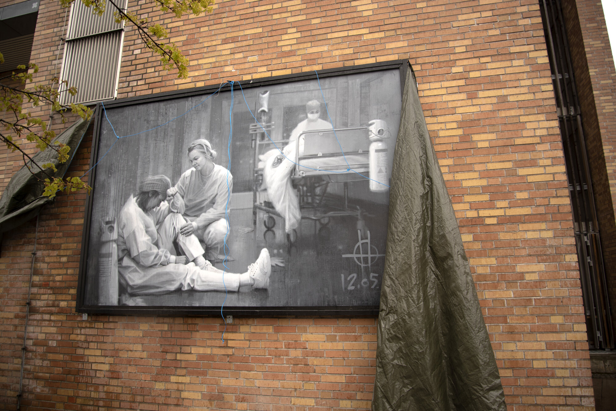 Sykepleierportrettet, som er malt av gatekunstner Håkon Børs-Lind, er med dette flyttet fra Oslo S til Rikshospitalets inngangsparti.