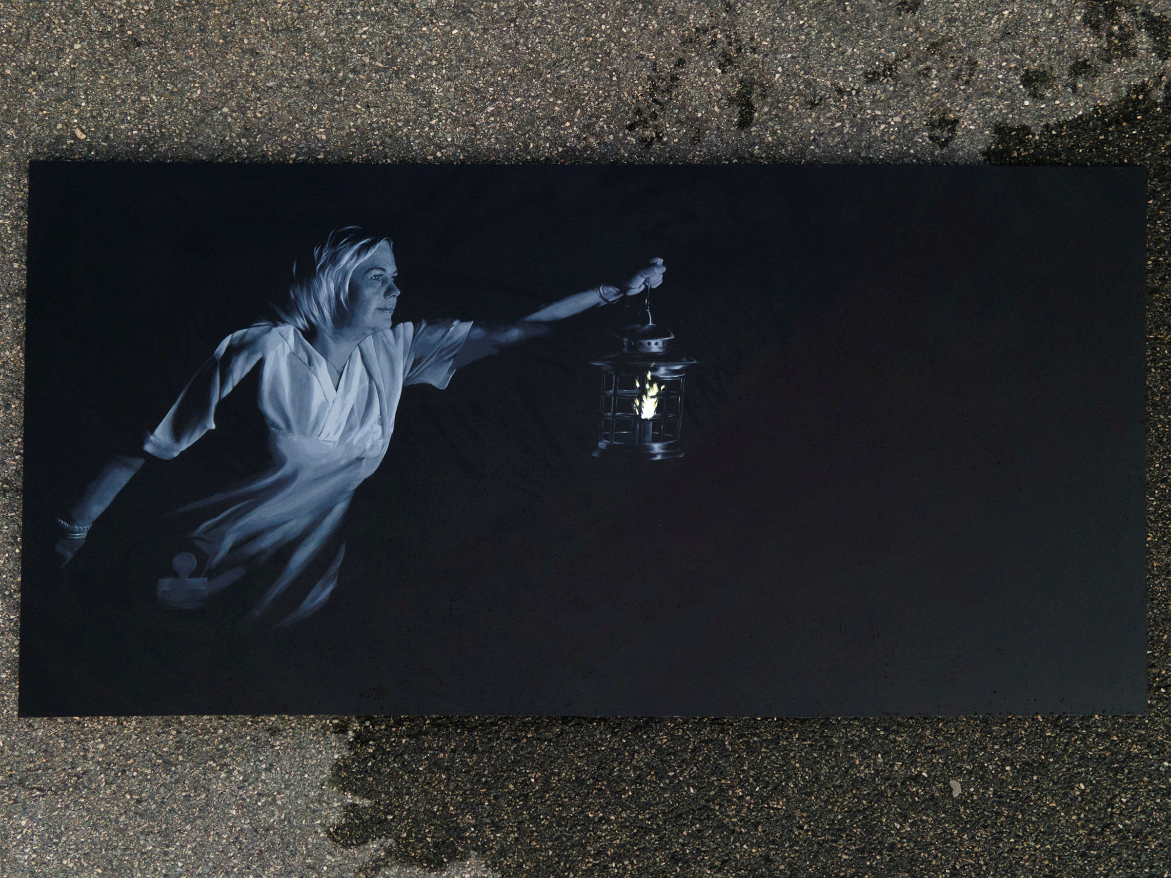 I bildet, som måler 3 meter x 1,50 meter, speider sykepleieren ut i mørket.