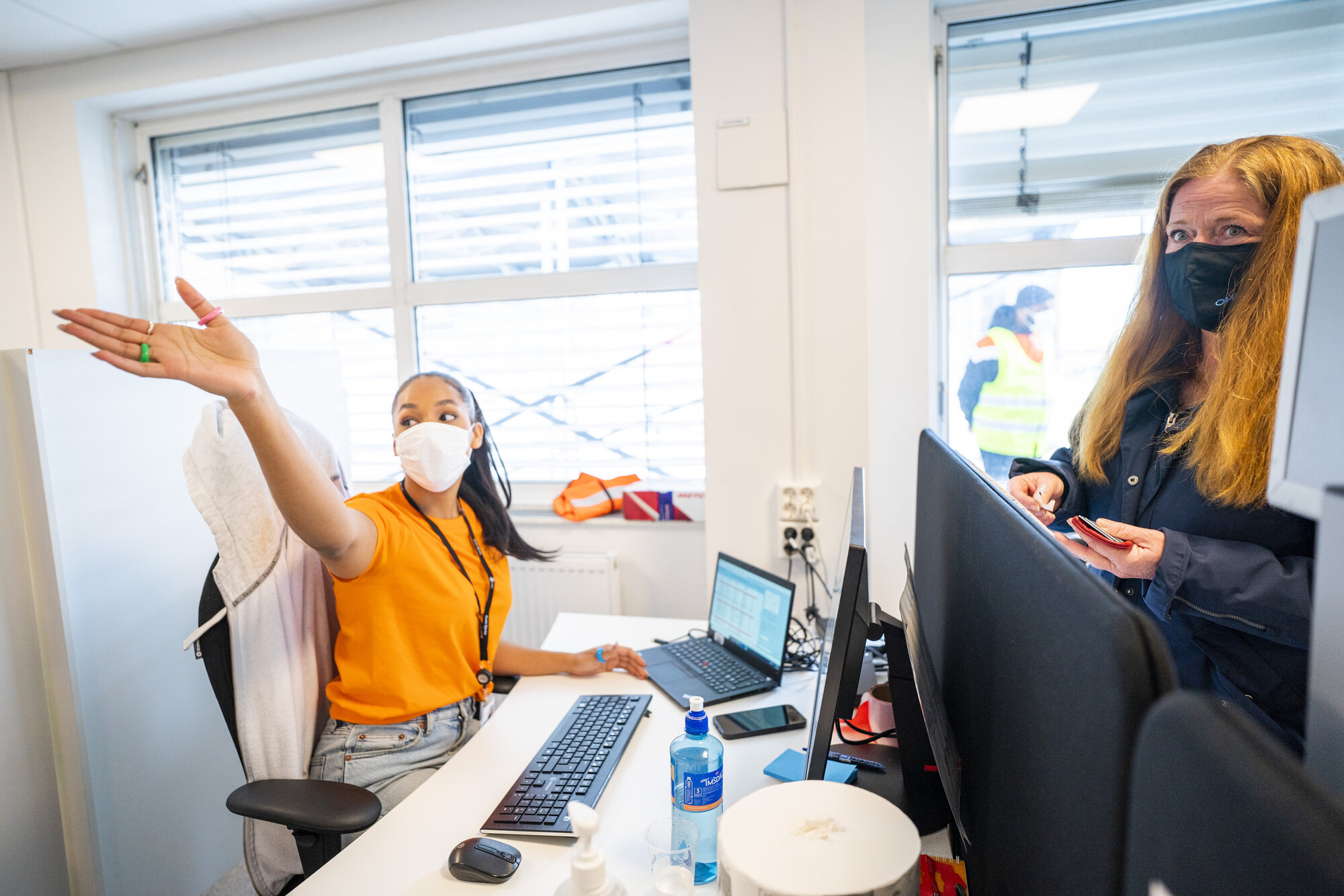 Bildet viser koronavert Une Gjerdenstad som viser vei for Hilde Arnesen, som skal ta vaksine.