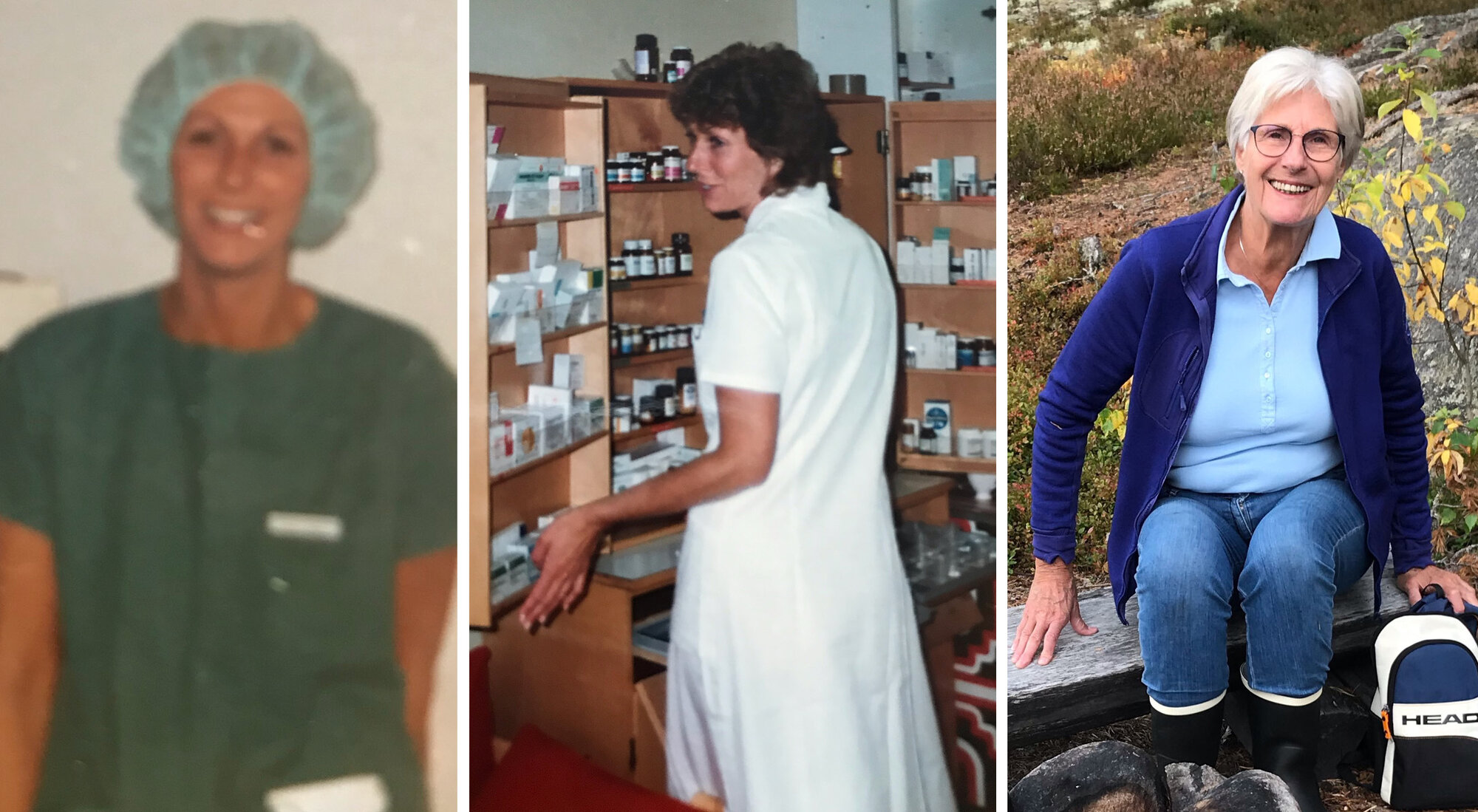 Bildet viser Grethe Lauritzen som sykepleierstudent, sykepleier og pensjonist.