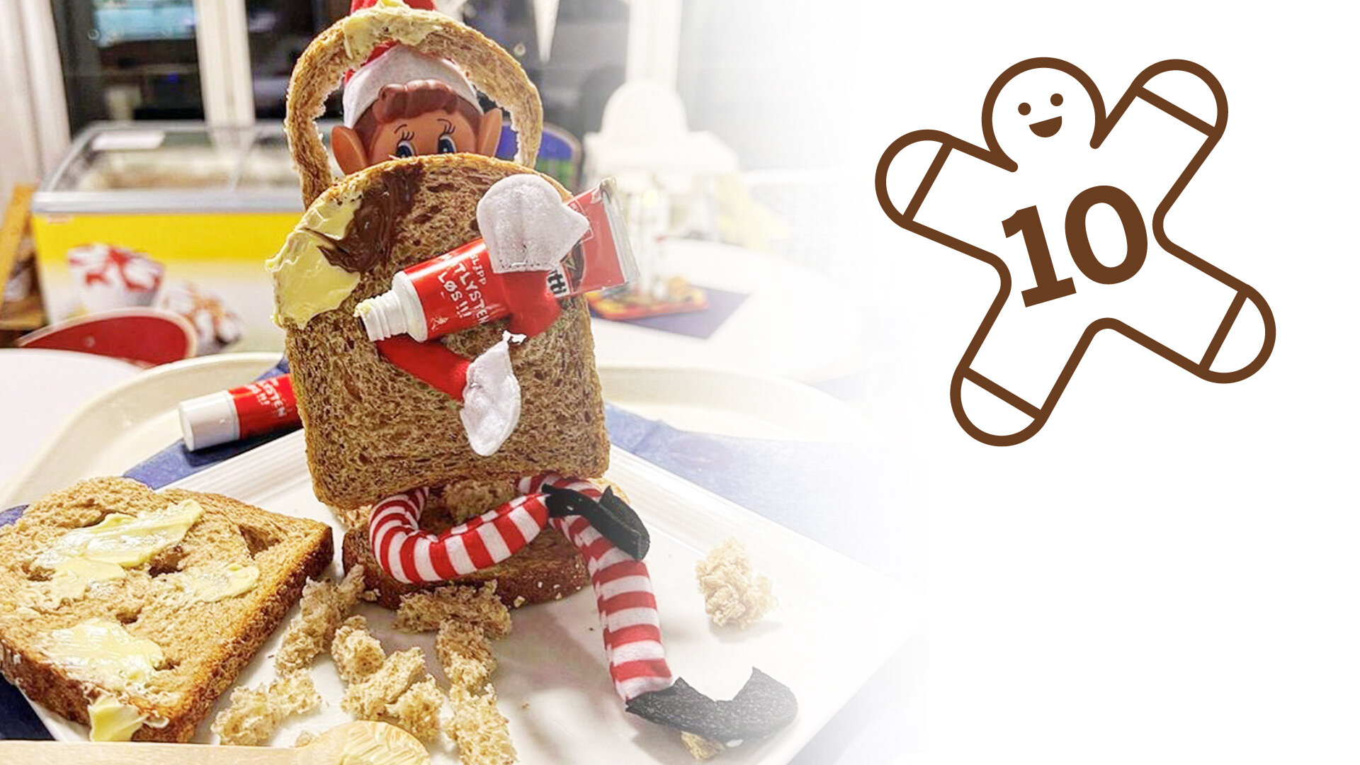 Siden 1. desember har nissen blant annet fisket i vasken, kjørt Brio-tog som blindpassasjer og satt seg fast i en brødskive.