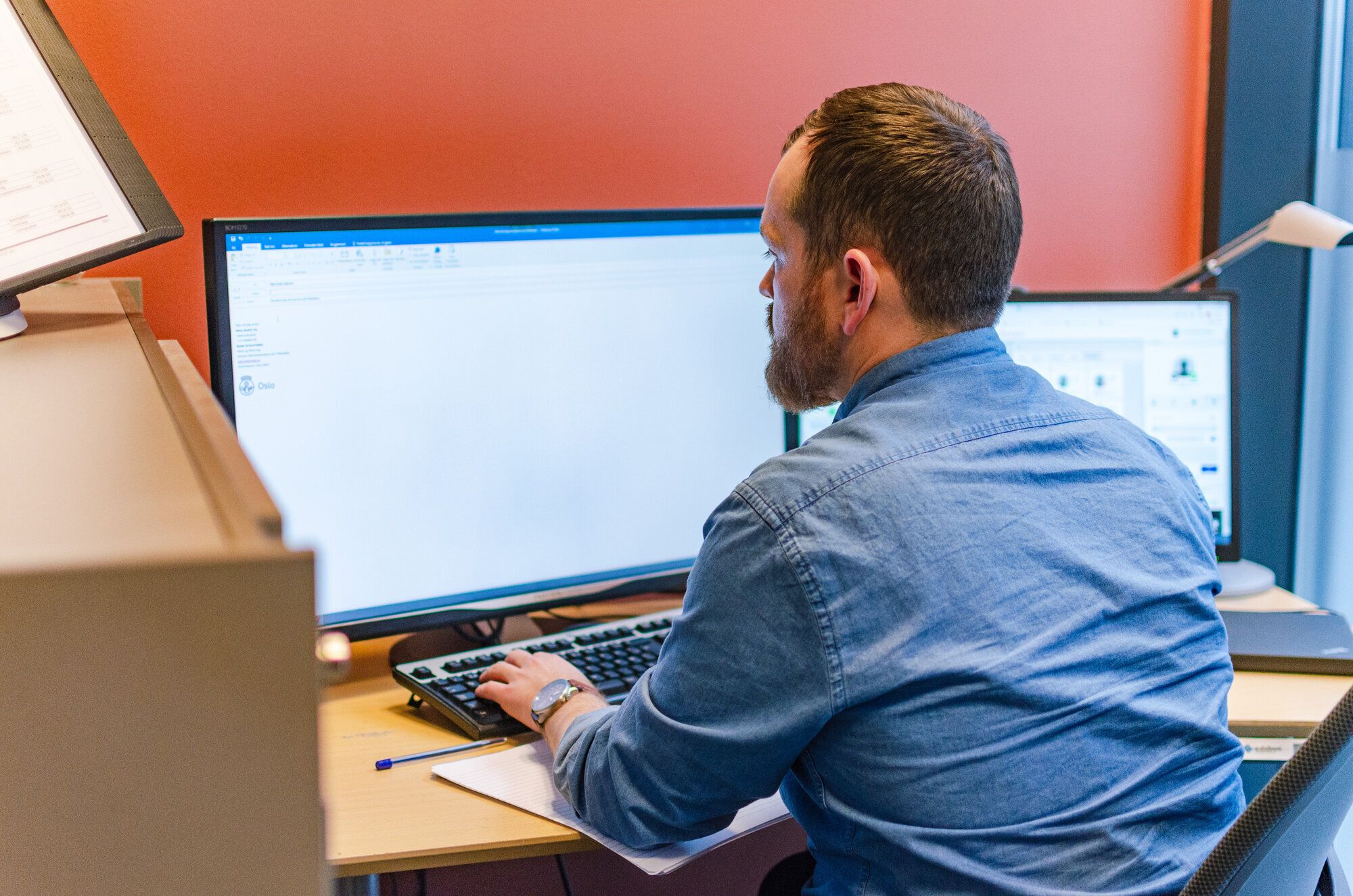 Tilnærmet midt i lokalet sitter teamsykepleierne Martin Brønner og Mats André Vie. De har det overordnede ansvaret for koordinering og tilrettelegging for både pleiere og pasienter.