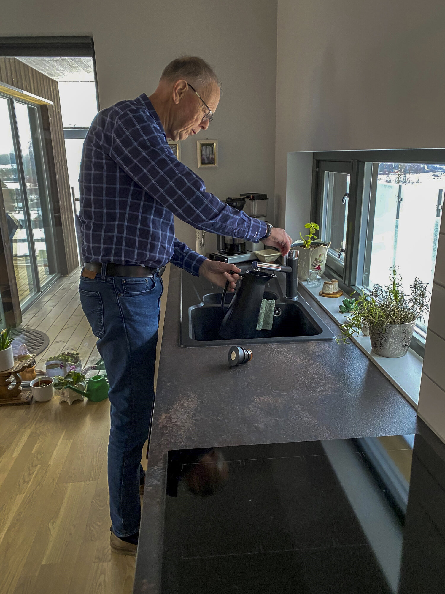 Sindre Børke heller kaffe over i en stor kanne inne på kjøkkenet.