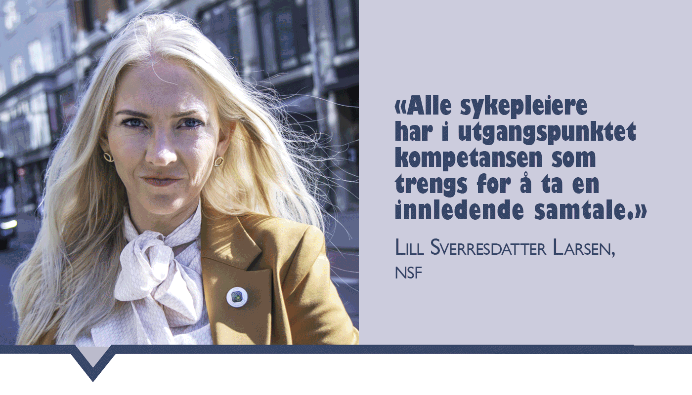 – Men alle sykepleiere har i utgangspunktet kompetansen som trengs for å ta en innledende samtale og så vurdere om ytterligere spesialkompetanse er nødvendig.