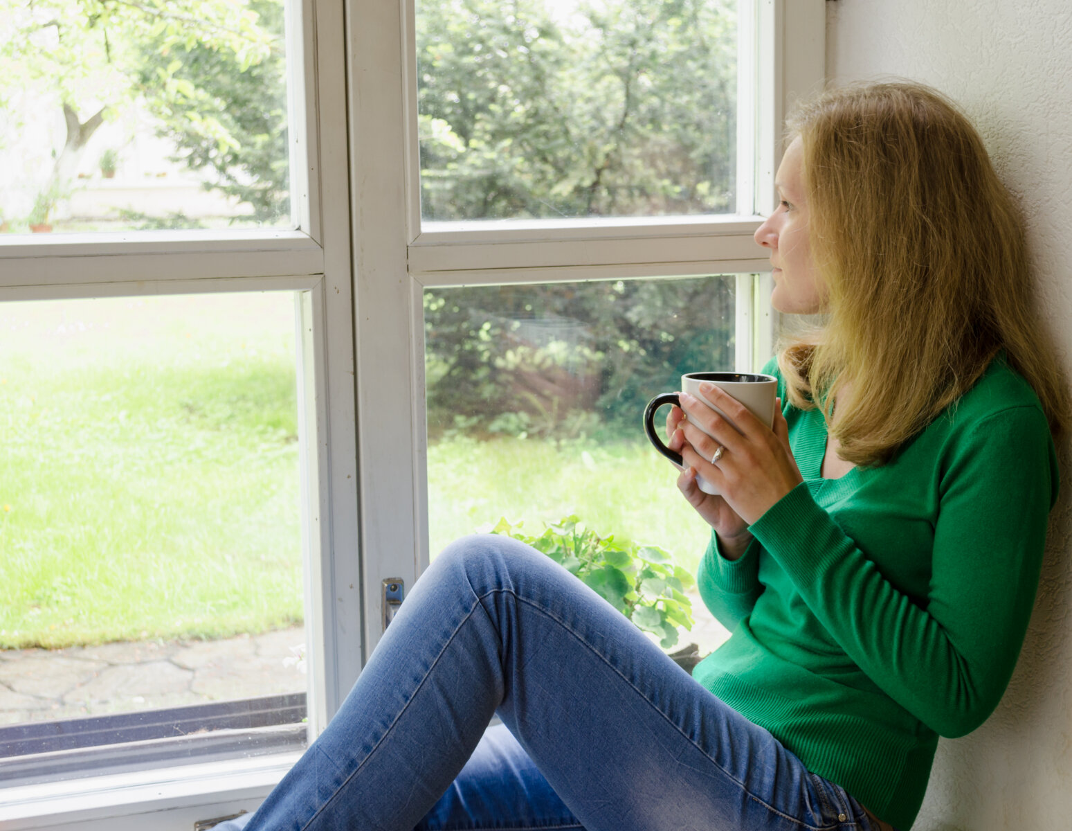 Bildet viser en kvinne som sitter og ser ut av et vindu.