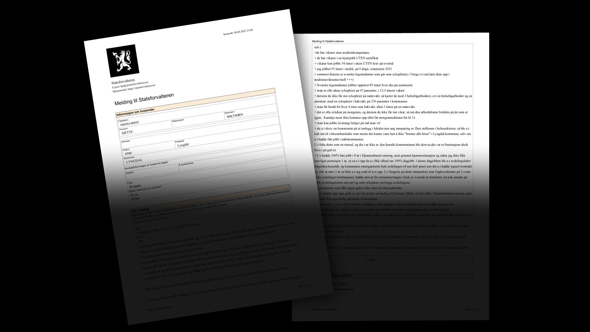 I april sendte sykepleier Mette Biktjørn inn en bekymringsmelding til Statsforvalteren i Agder om arbeidsforholdene ved hjemmesykepleien i Lyngdal kommune. Hun mener de kritikkverdige forholdene har pågått i ti år.