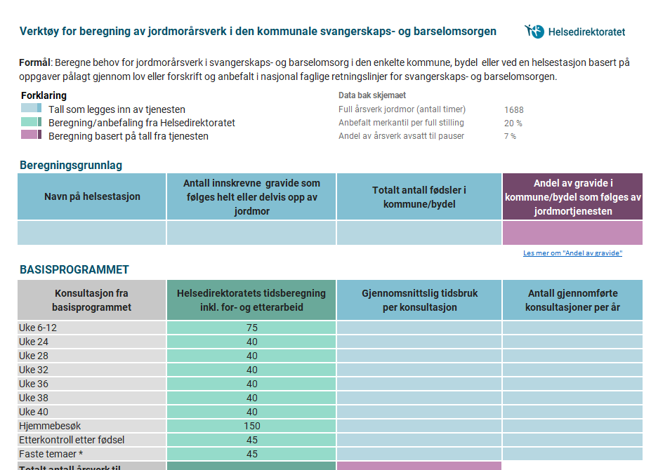 – Målet med verktøyet er å gjøre det lettere for ledere i tjenesten å planlegge hvor mange jordmødre og kontorfaglige ansatte som trengs på helsestasjonen hver dag for å ivareta oppgavene som er pålagt gjennom lov og forskrift, Nasjonal faglig retningslinje for svangerskapsomsorg og barselomsorg samt andre oppgaver, sier hun.