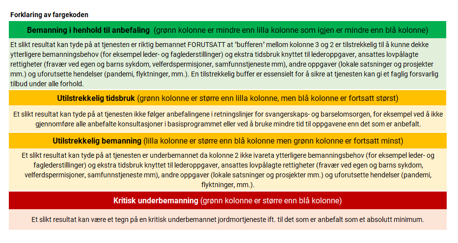 Ved å legge inn blant annet antall jordmødre i kommunehelsetjenesten, antall fødsler, stillingsprosent og så videre, kommer det en «fasit» som viser om kommunen er under- eller eventuelt overbemannet i jordmortjenesten.
