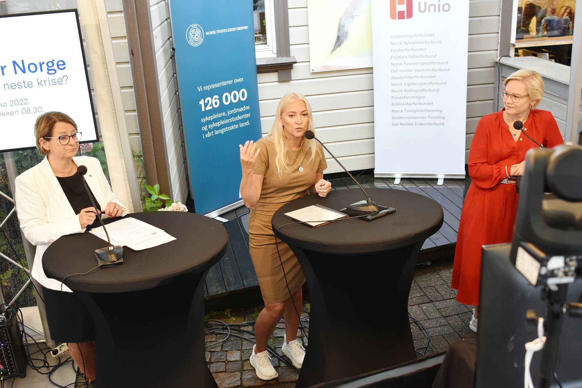 Debatten om hvorvidt vi er rustet til å takle fremtidige kriser overtok debattleder Anne Hafstad, redaktør i Sykepleien. Deltakerne var helse- og omsorgsminister Ingvild Kjerkol (Ap), leder i Stortingets helse- og omsorgskomité, Tone W. Trøen (H) og NSF-leder Lill Sverresdatter Larsen.