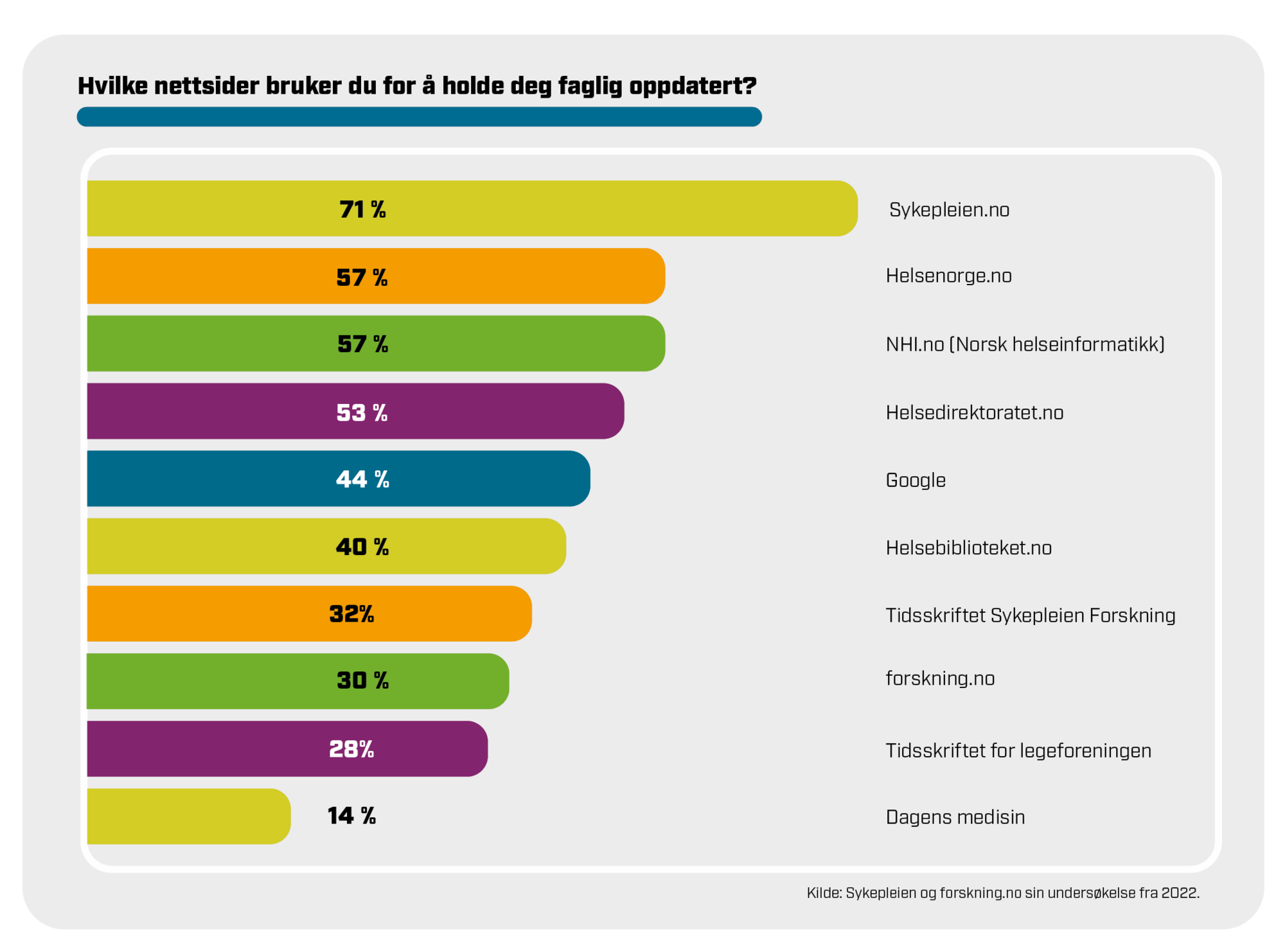 De aller fleste, 71 prosent, sier at de bruker Sykepleien til å oppdatere seg faglig i jobben sin. 30 prosent bruker forskning.no. Mer enn halvparten bruker offentlige nettsider, som helsenorge.no og helsedirektoratet.no.