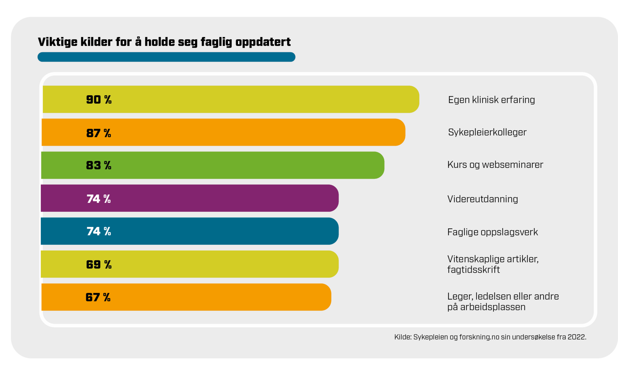 Vi spurte sykepleierne om hvilke kilder de bruker for å holde seg faglig oppdatert. 90 prosent svarer at egen erfaring er viktig eller svært viktig.