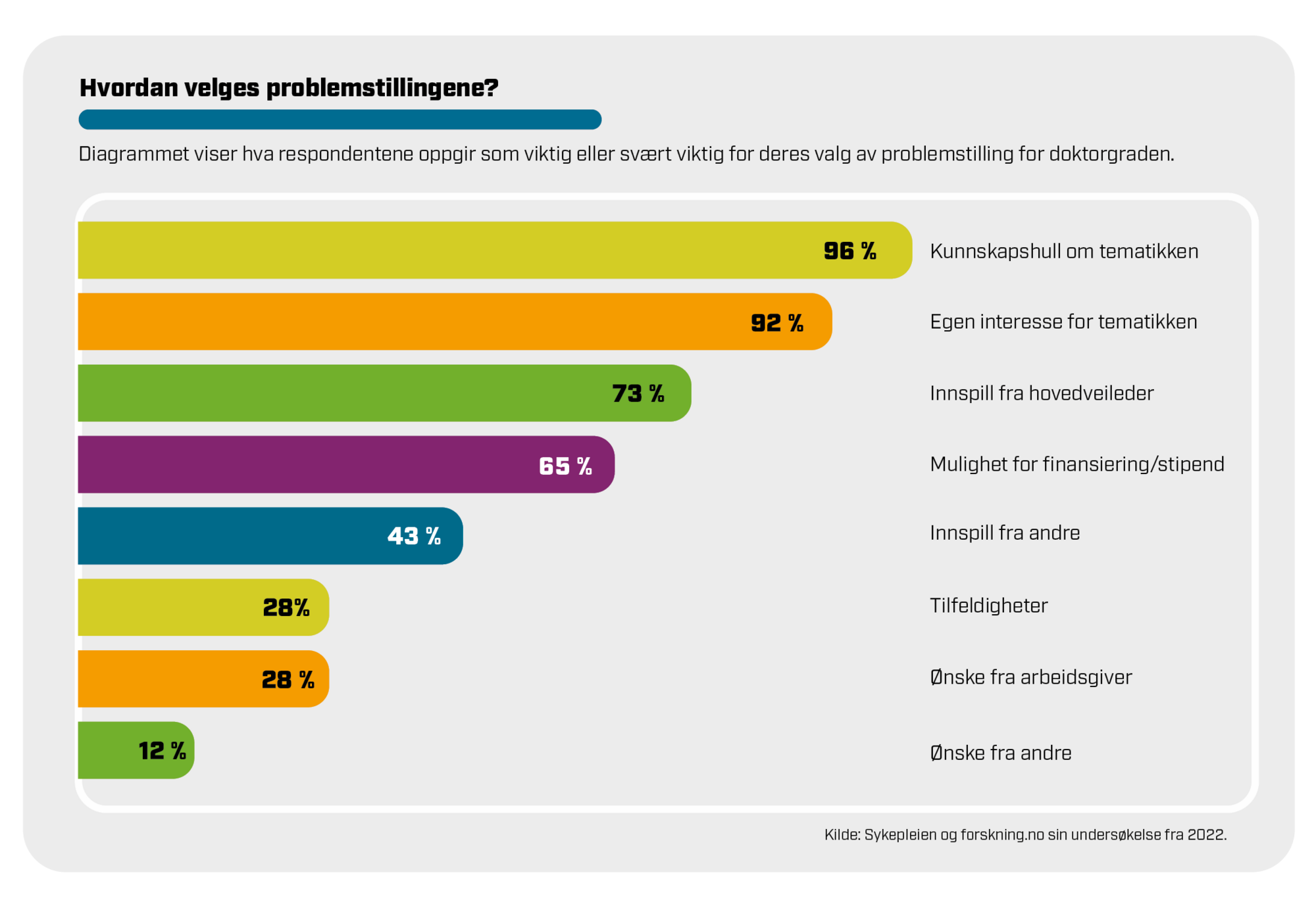 Når det gjelder valg av problemstillinger for avhandlingene, oppgir sykepleierne oftest at de er motivert av kunnskapshull og egen interesse for tematikken. Begge disse faktorene vurderes som svært viktig for rundt 6 av 10 respondenter.