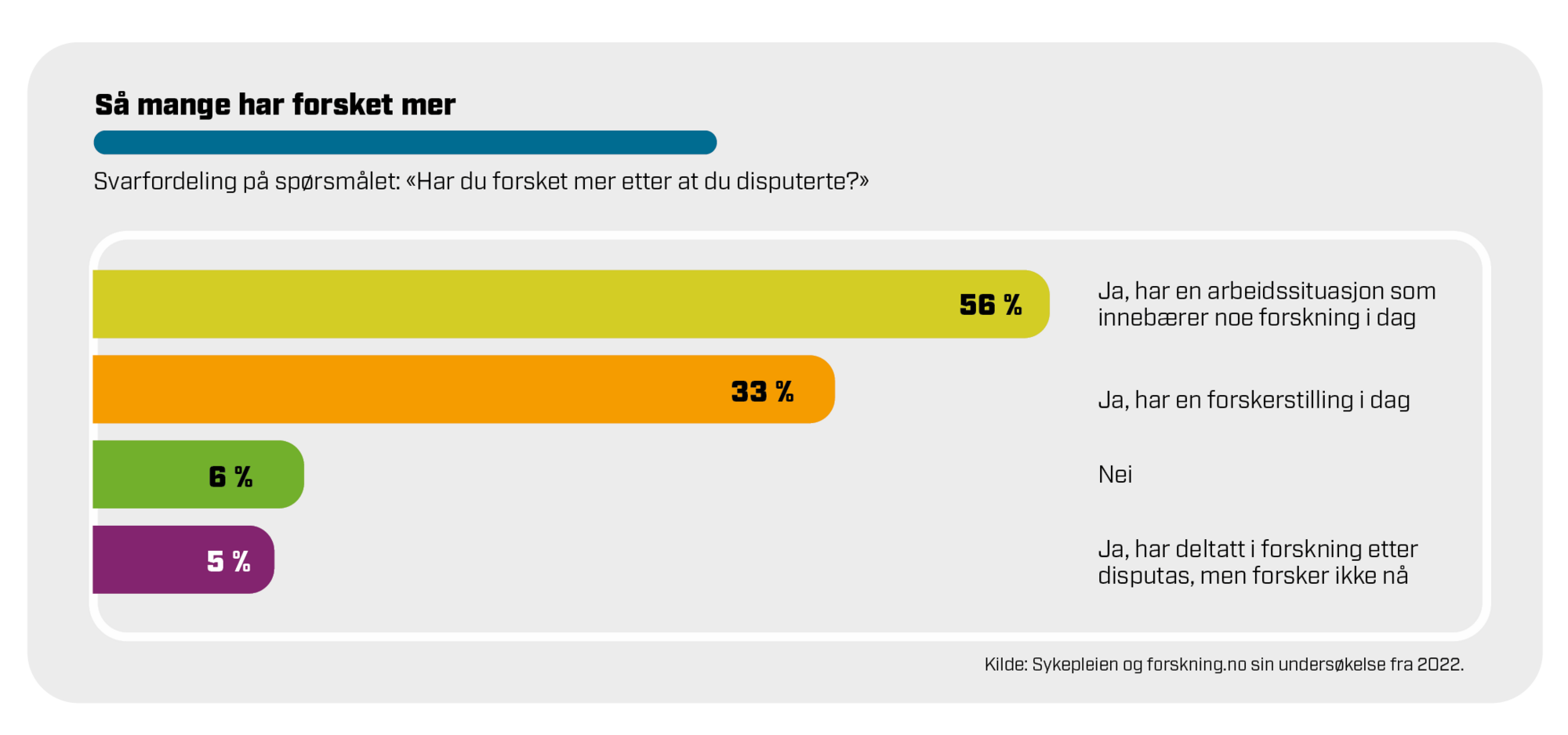 Et stort flertall av deltakerne i undersøkelsen oppgir at de har forsket mer etter fullført disputas. 33 prosent oppgir å ha en forskerstilling i dag, mens 56 prosent sier de har en arbeidssituasjon som innebærer noe forskning.