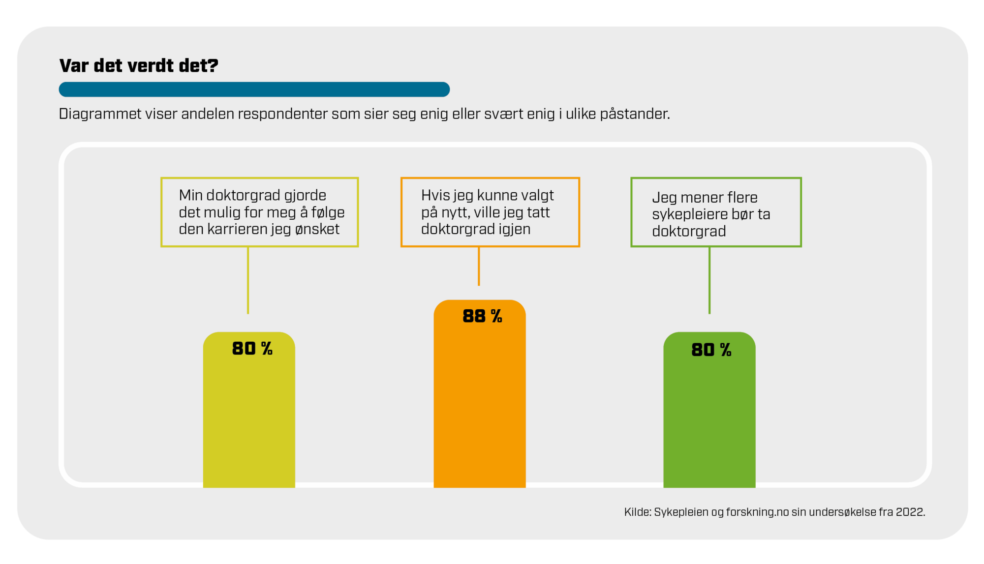 Med tanke på alt som skrives om frustrerende lønnsnivå, tøffe turnuser, underbemanning og belastningsskader, kunne man kanskje tenke seg at en del så doktorgraden som en vei vekk fra sykepleieryrkets mindre attraktive sider.