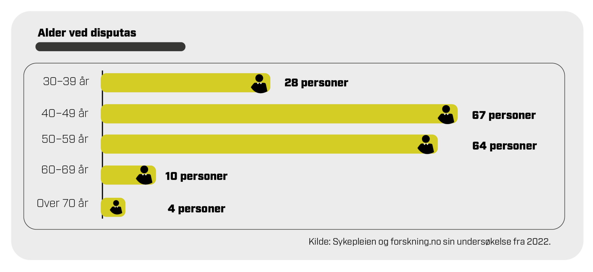 Sykepleiere er gjerne godt voksne og erfarne når de tar sin doktorgrad. I snitt var deltakerne i undersøkelsen 48,2 år ved disputasen. Dette er rundt ti år over landsgjennomsnittet for alle doktorander, ifølge tall fra Nordisk institutt for studier av innovasjon, forskning og utdanning (Nifu).