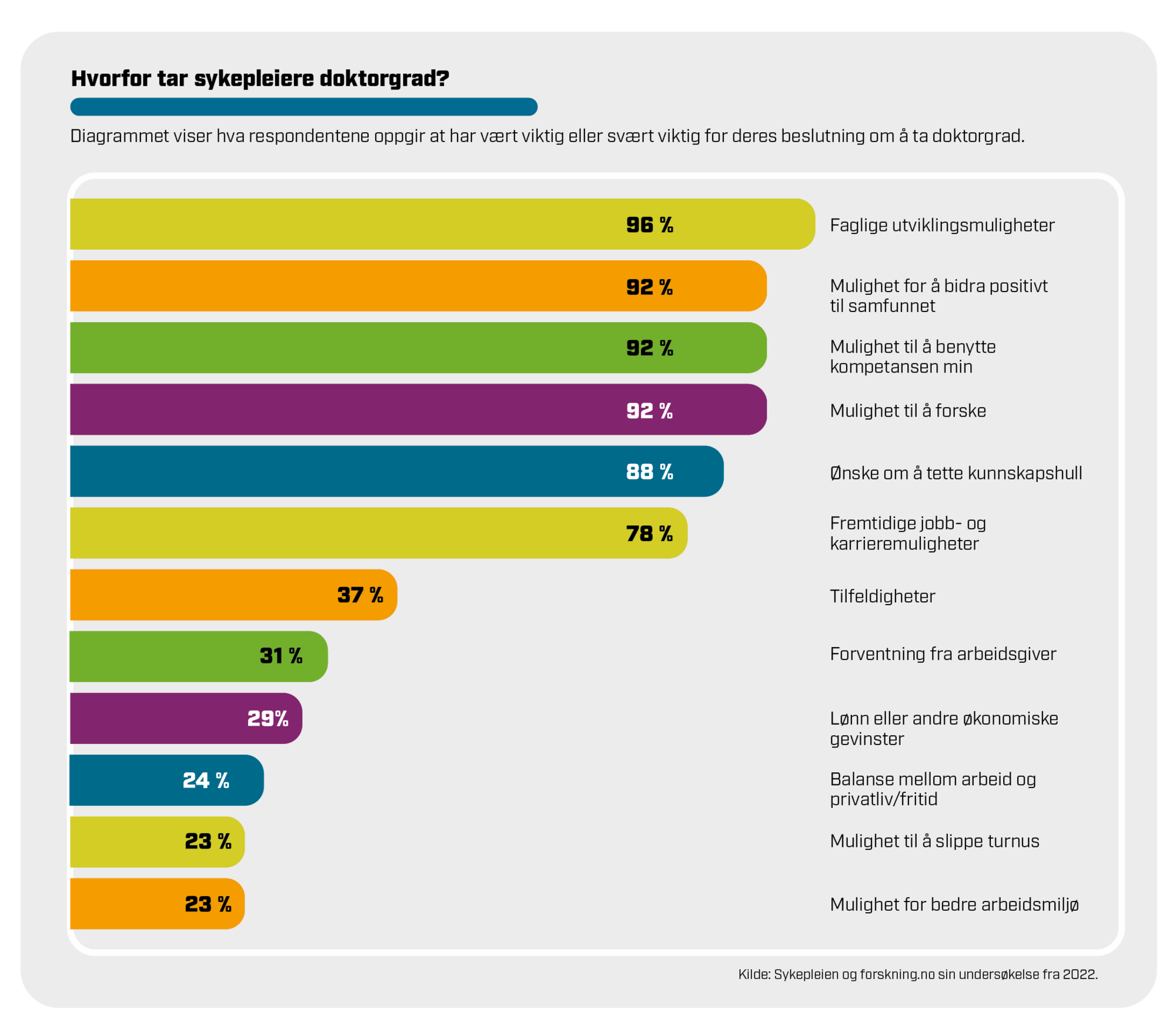 Svarene indikerer derimot at den viktigste motivasjonen for sykepleiere til å ta doktorgrad er faglige utviklingsmuligheter. Hele 77,5 prosent oppgir at dette var svært viktig for deres beslutning.