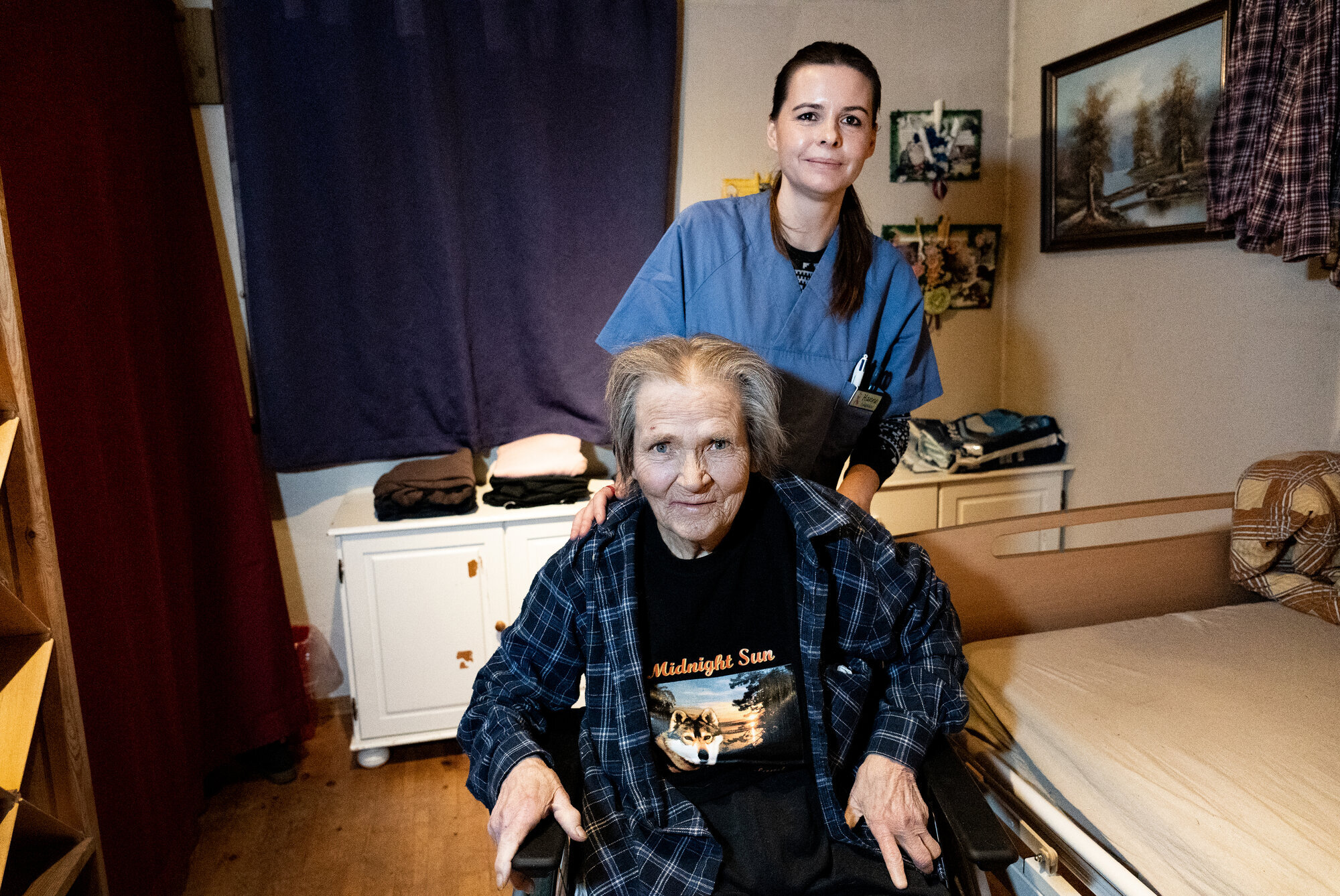 – Jeg tror alle i hjemmetjenesten har fått strikkeplagg av Annbjørg. Hun er en racer til å strikke, forteller Lykkedrang, mens hun triller 80-åringen inn på badet for å få gjort unna morgenstellet.