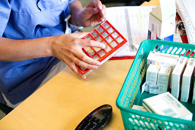 Hjemmesykepleier legger medisiner oppi en dosett.