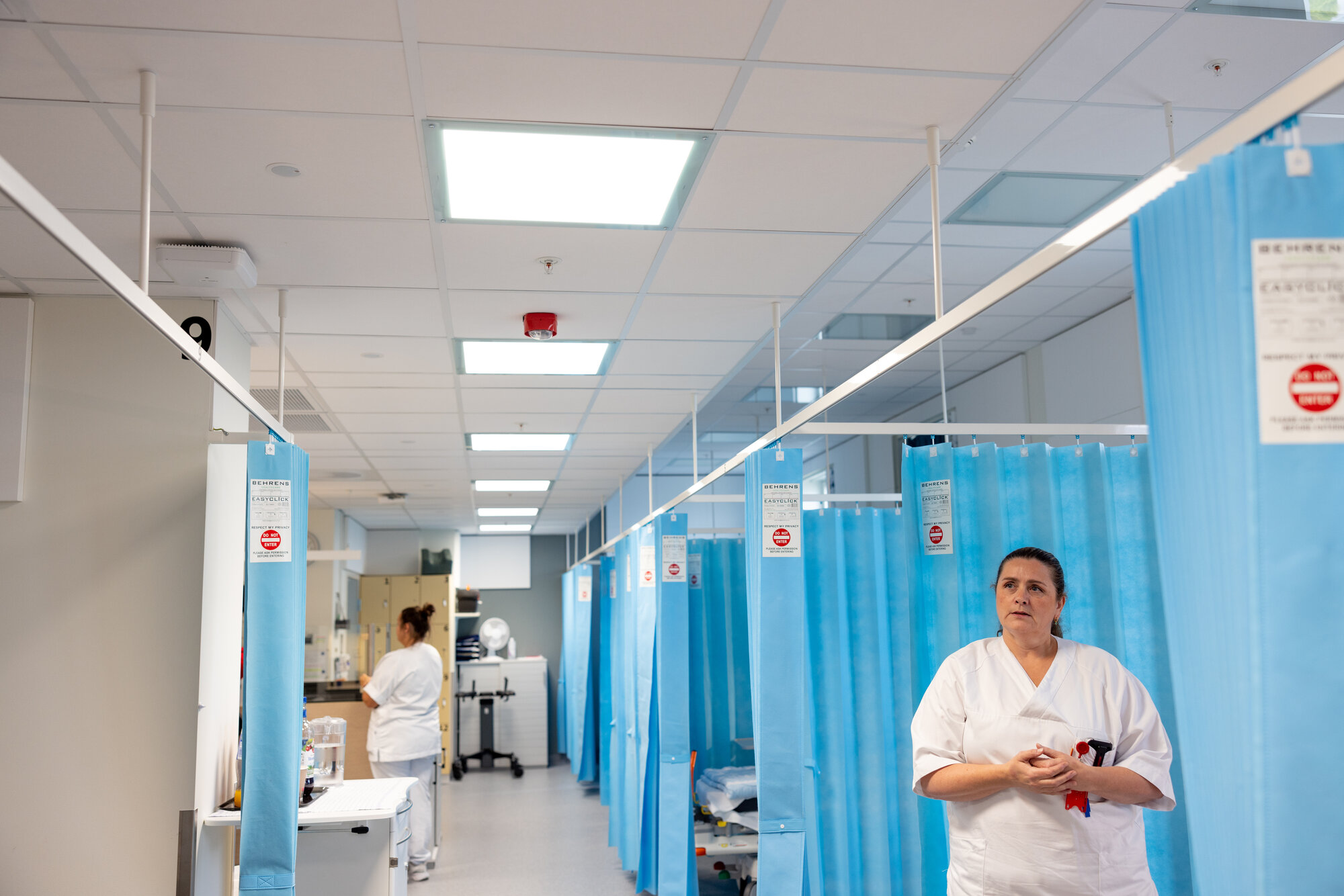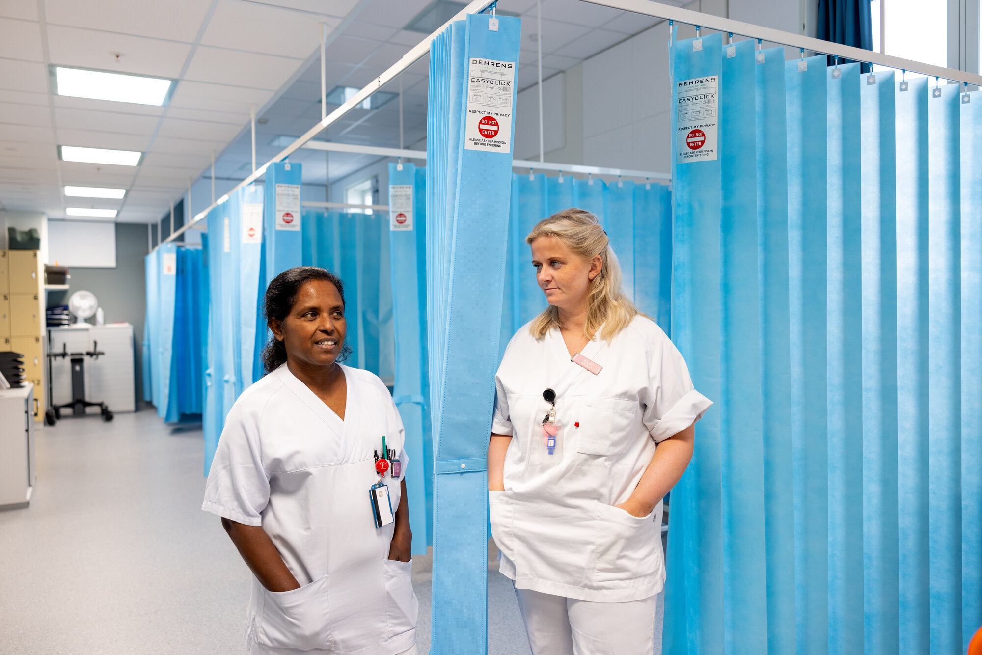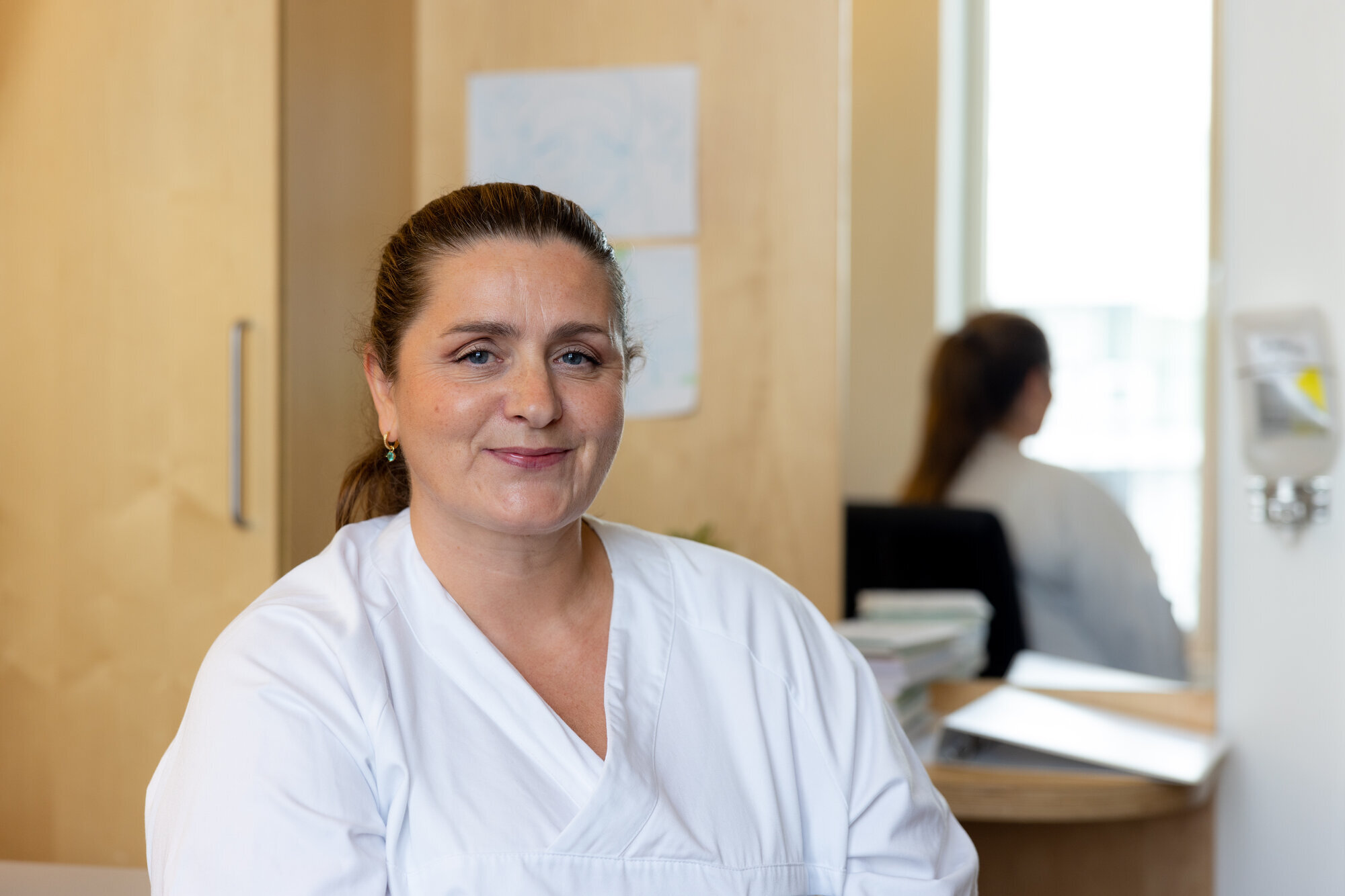 Sykepleierne har base i enden av rommet. De går til og fra sengene, svarer på telefoner og følger opp spørsmål og gir informasjon til de nyopererte pasientene.