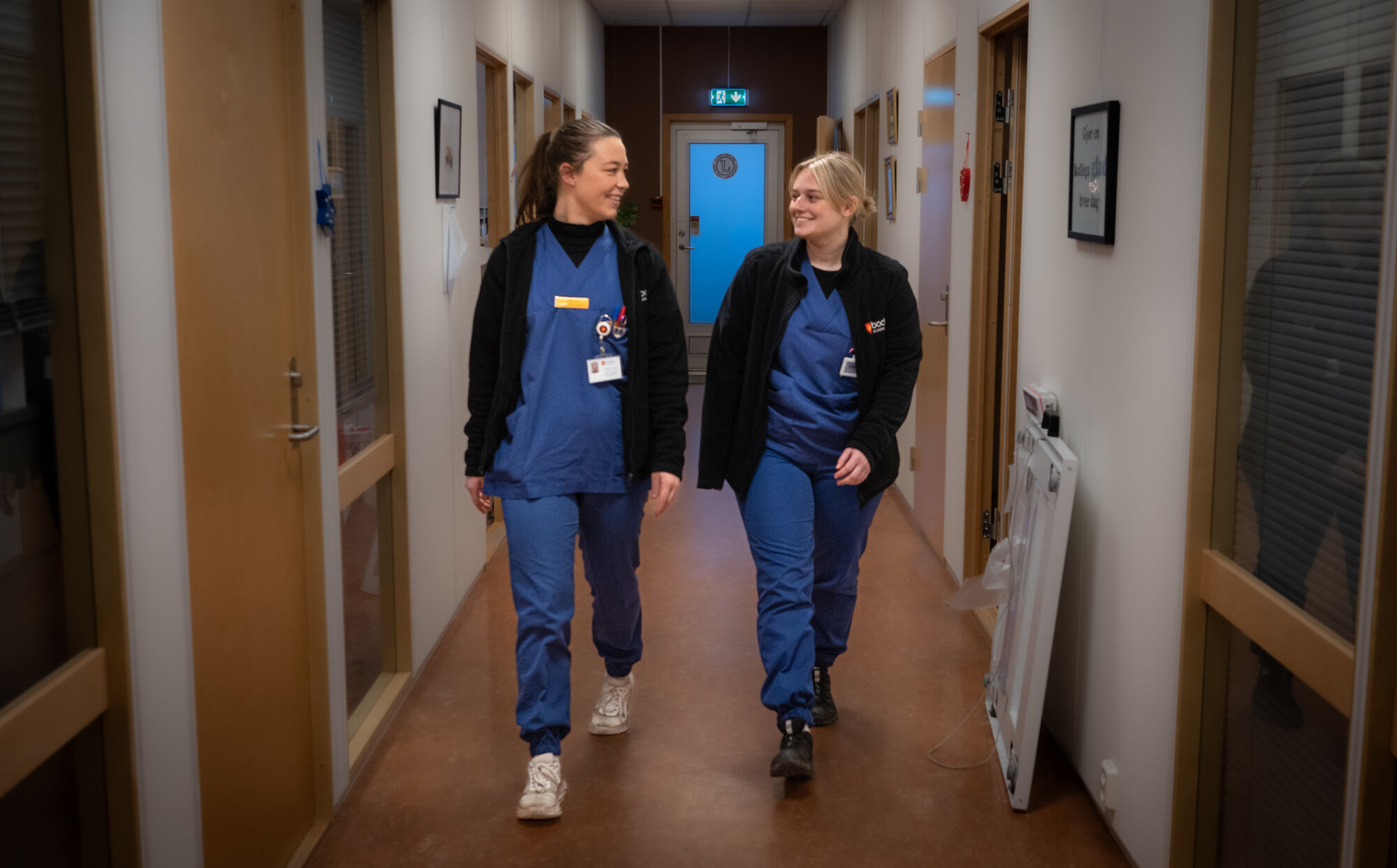 Så kommer de gående med forsiktige smil: Studentansvarlig og fagutviklingssykepleier Anders Sarassen og andreårs-studentene Erica Jørgensen og Emma Østvik. De er i sin sjette praksisuke og har to uker igjen.