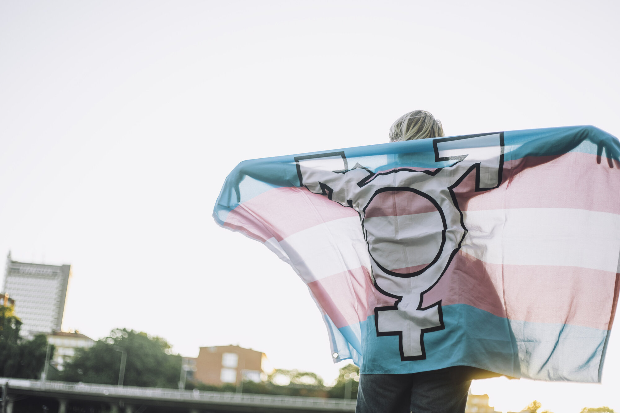 Bildet viser en person som holder opp et flagg med kjønnssymboler