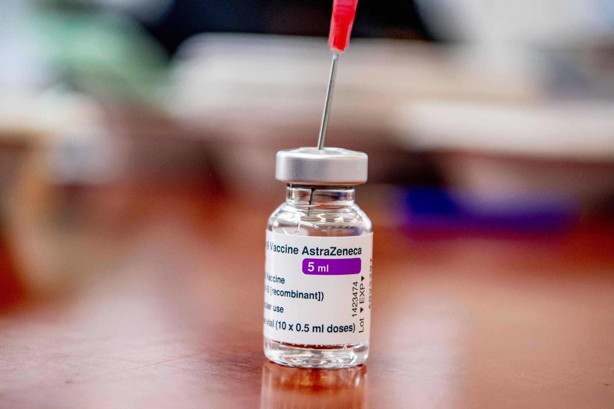 Bildet viser en flaske med AstraZenica vaksine med en kanyle