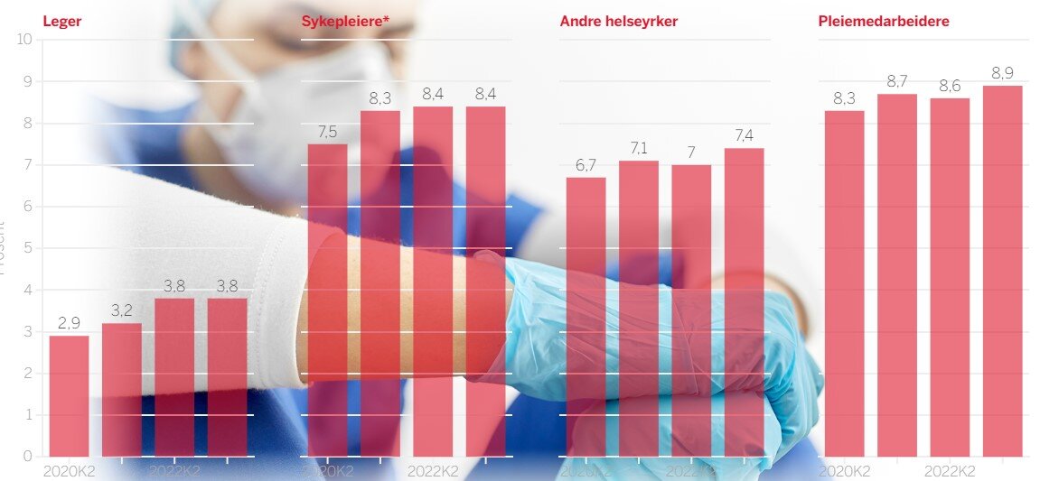 Helse- og sosialnæringen har fortsatt det høyeste legemeldte sykefraværet (8,1 prosent), men har bare hatt en liten økning i forhold til samme kvartal året før. Og legger vi sammen det lege- og egenmeldte sykefraværet i helse- og sosialnæringen, gikk dette tilbake med 0,1 prosentpoeng.
